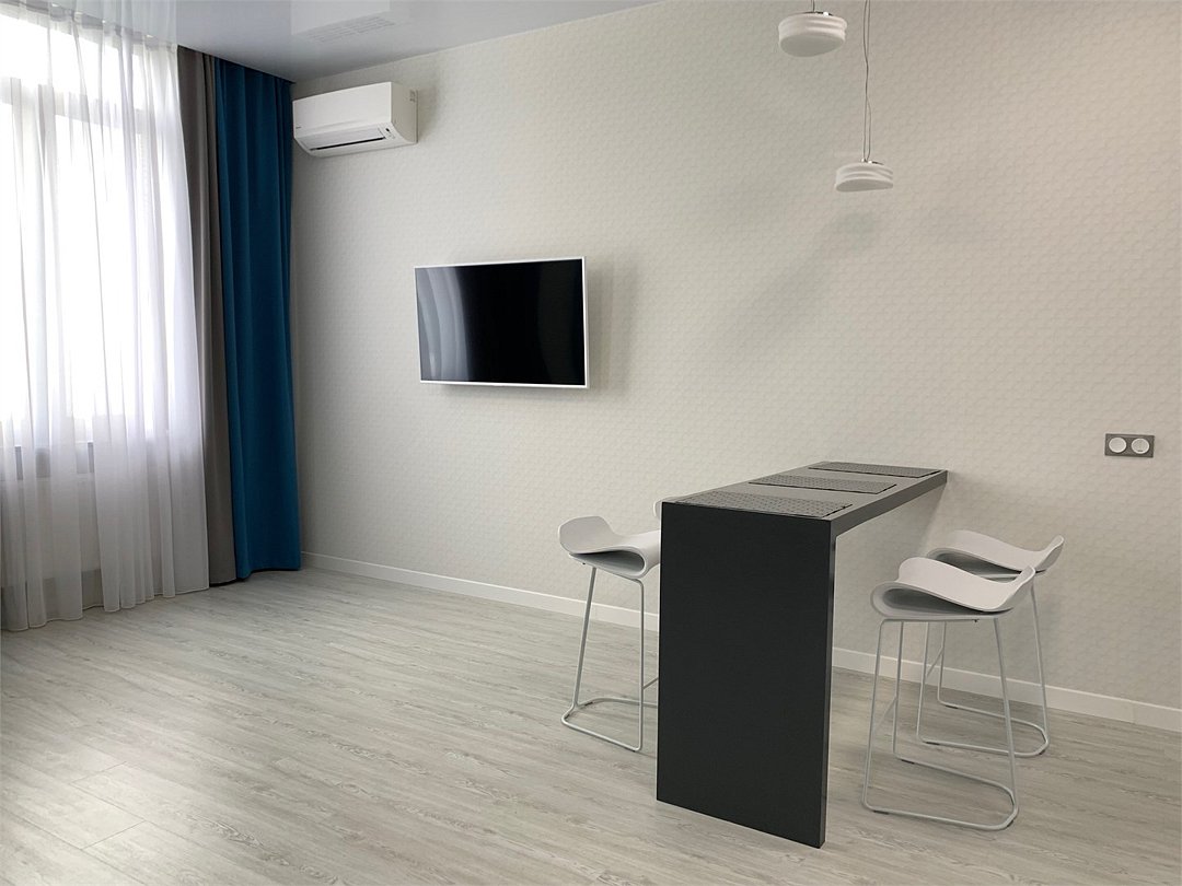 кабельное телевидение, Wi-Fi, кондиционер, светильник, фен, электронные замки, плита для приготовления пищи, душевая кабина, банные принадлежности, халаты, пляжные полотенца, тапочки, гигиенические средства, косметические средства, двуспальная кровать, тумбы, стулья, шкаф для одежды, гардеробная, вешалки, письменный стол, барная стойка, зеркало, комод, две комнаты, кухня, набор посуды, раковина, отопление, кулер на этаже, ламинат, высокие потолки, кухонная посуда, столовые приборы, туалетные средства, туалет, диван-кровать, телевизор с плоским экраном, мини-холодильник, мини-кухня, москитная сеткаВ номере