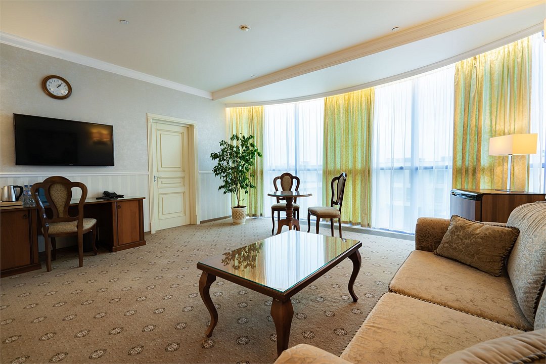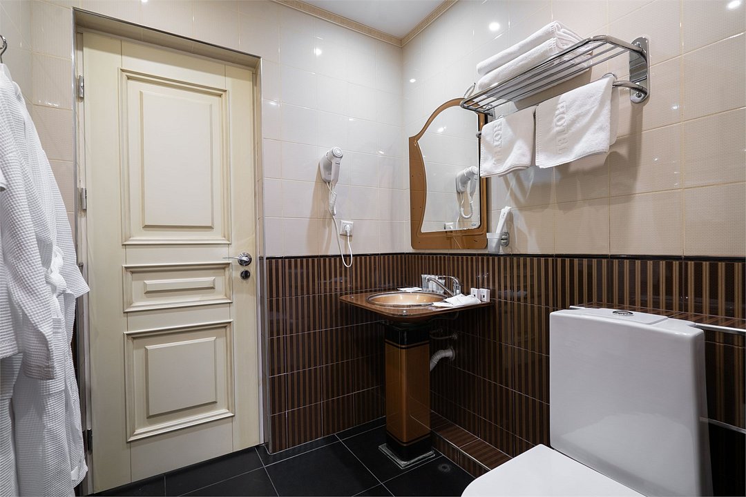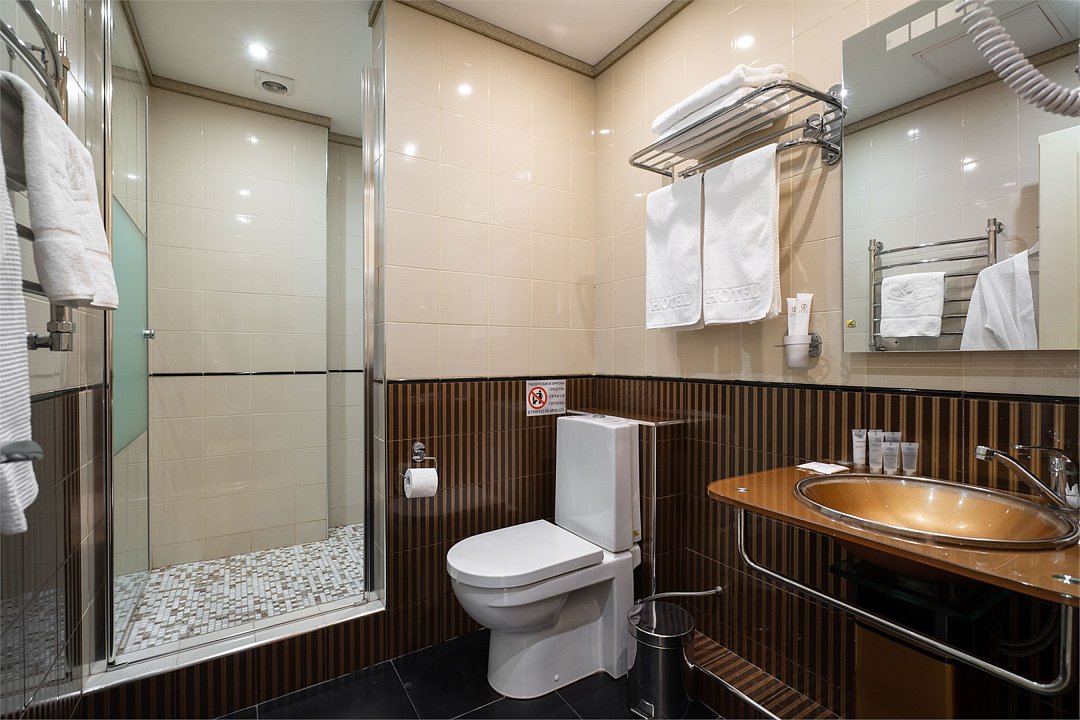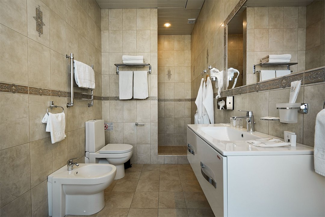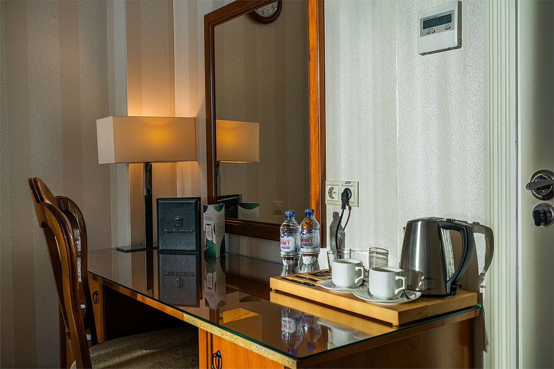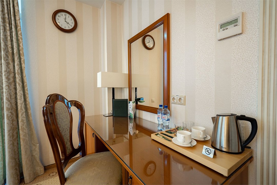 телевизор, Wi-Fi, фен, утюг, ванная комната, душевая кабина, санузел, халаты, банные полотенца, тапочки, гигиенические средства, косметические средства, балкон, двуспальная кровать, диван, тумбы, стулья, вешалки, журнальный столик, зеркало, чайный набор, сейф, чайник, унитаз, раковина, мягкая мебель, ковровое покрытие, душ, вид на город, кресло, центральное кондиционирование, стаканы, туалетный столик, стул, стол, туалетный столик, туалетные средства, туалет, сплит-система, внутренний телефон, мини-холодильник, чайная станция, уборка номера, бутилированная вода, СПА, без питомцевВ гостиничном номере
