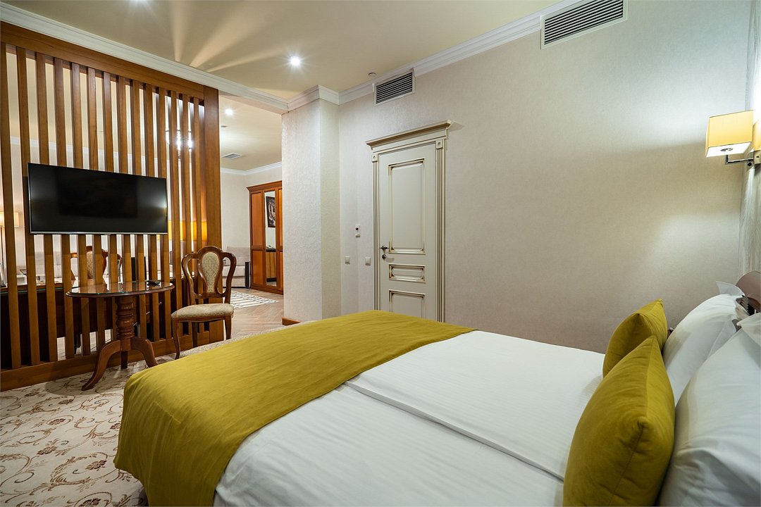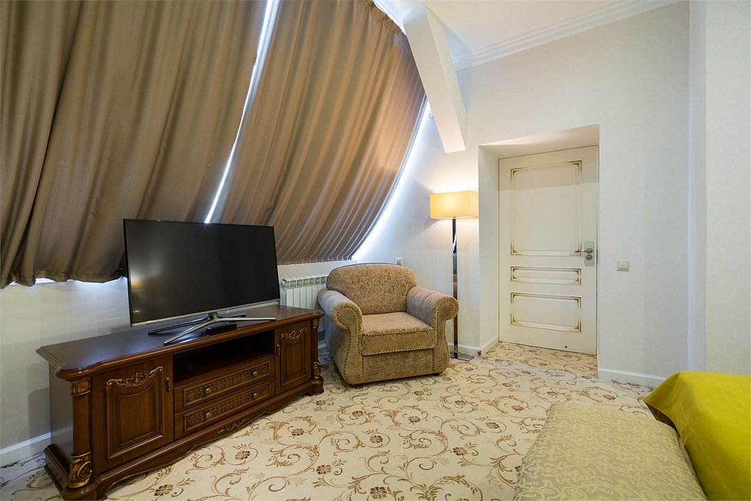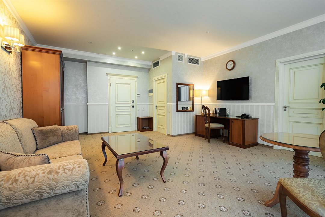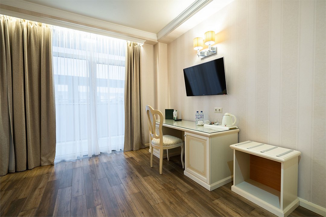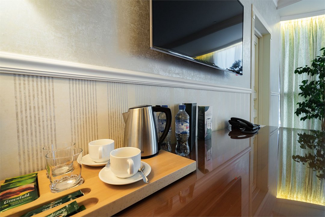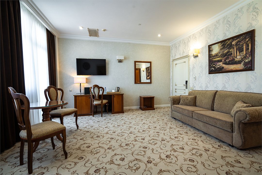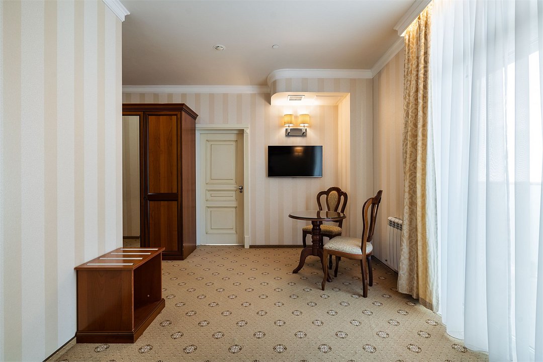 телевизор, Wi-Fi, фен, утюг, ванная комната, душевая кабина, санузел, халаты, банные полотенца, тапочки, гигиенические средства, косметические средства, балкон, двуспальная кровать, диван, тумбы, стулья, вешалки, журнальный столик, зеркало, чайный набор, сейф, чайник, унитаз, раковина, мягкая мебель, ковровое покрытие, душ, вид на город, кресло, центральное кондиционирование, стаканы, туалетный столик, стул, стол, туалетный столик, туалетные средства, туалет, сплит-система, внутренний телефон, мини-холодильник, чайная станция, уборка номера, бутилированная вода, СПА, без питомцевВ гостиничном номере