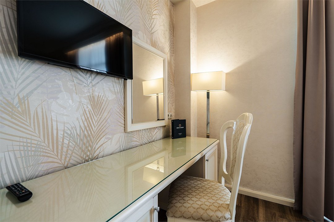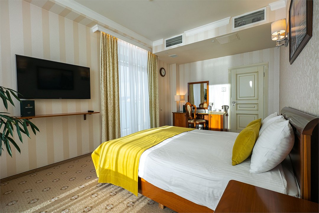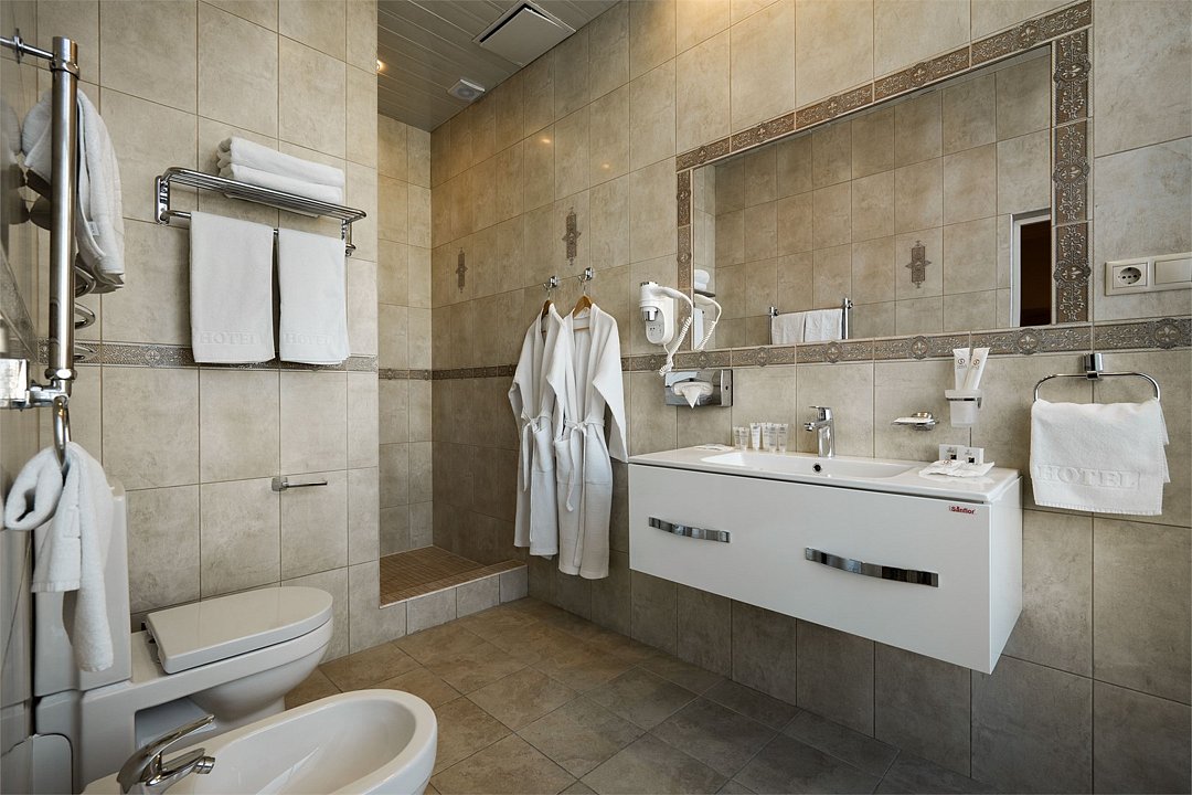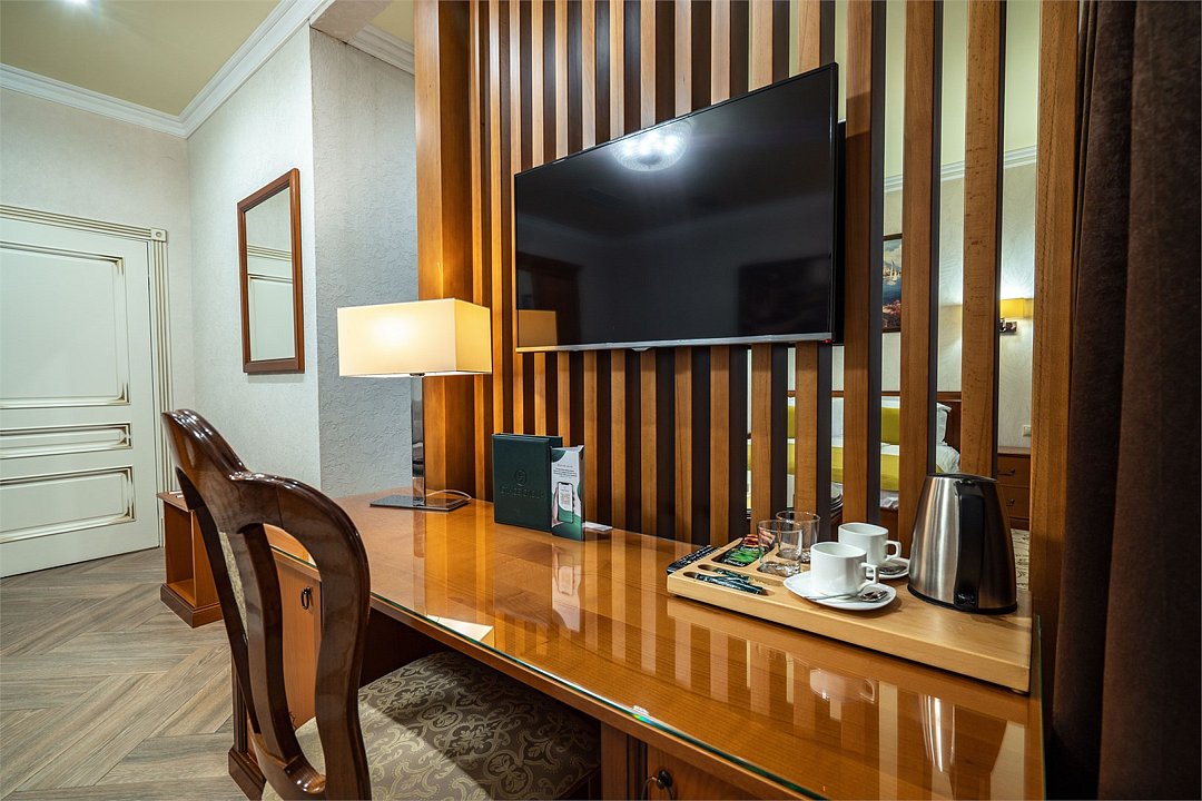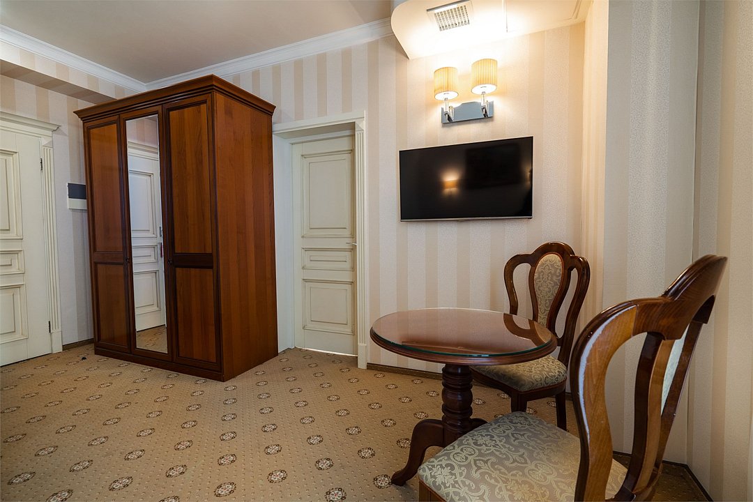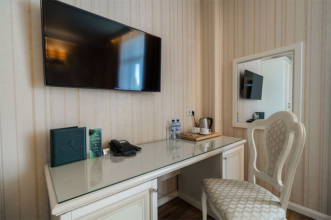 телевизор, Wi-Fi, фен, утюг, ванная комната, душевая кабина, санузел, халаты, банные полотенца, тапочки, гигиенические средства, косметические средства, балкон, двуспальная кровать, диван, тумбы, стулья, вешалки, журнальный столик, зеркало, чайный набор, сейф, чайник, унитаз, раковина, мягкая мебель, ковровое покрытие, душ, вид на город, кресло, центральное кондиционирование, стаканы, туалетный столик, стул, стол, туалетный столик, туалетные средства, туалет, сплит-система, внутренний телефон, мини-холодильник, чайная станция, уборка номера, бутилированная вода, СПА, без питомцевВ гостиничном номере