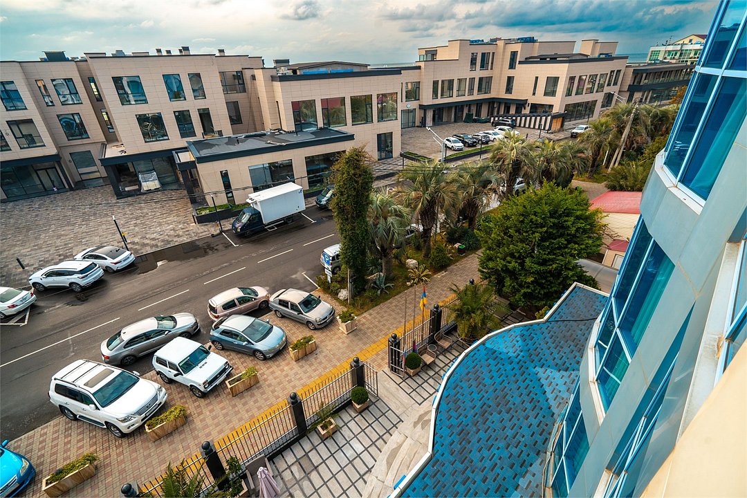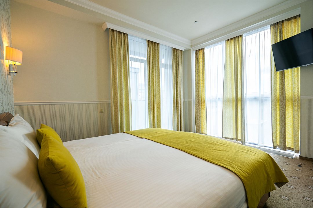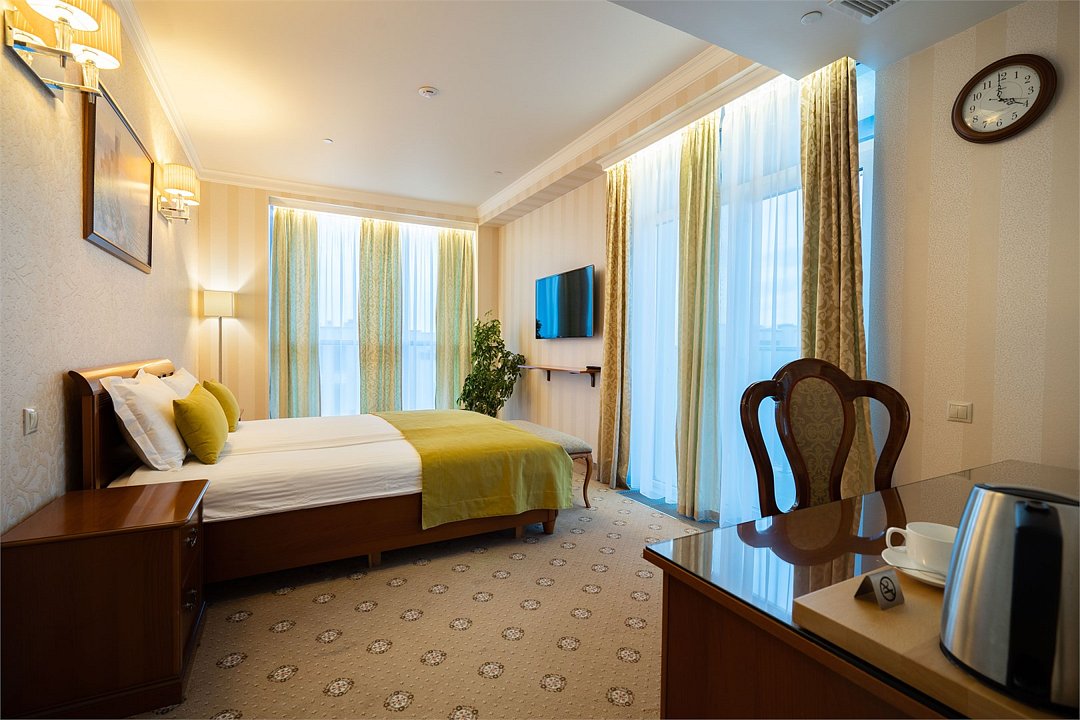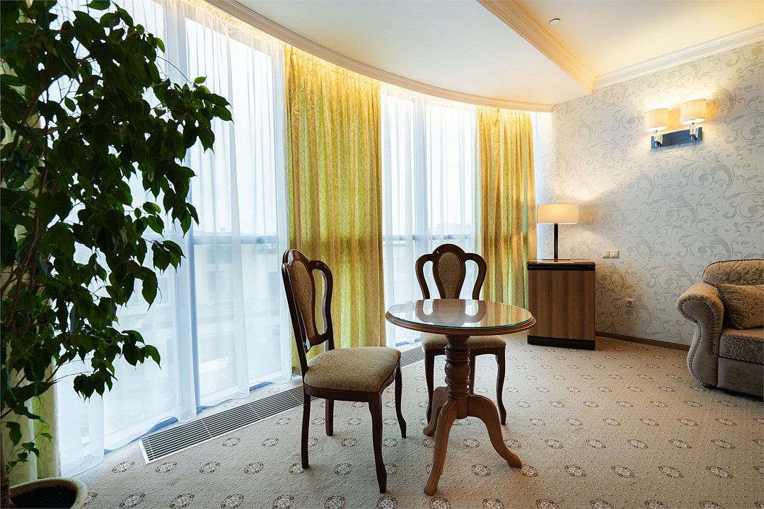 Девятиэтажный корпус отеля, оснащенный лифтом, находится на пересечении улицы Свердлова и улицы Просвещения. Жилой фонд, рассчитанный на заселение 134 гостей, предлагает отдыхающим номера разной категории комфорта — от Стандарте до Люкса. Везде стильный классический интерьер, выдержанные в бежевой цветовой гамме. Номера оснащены санузлом и бытовой техникой - есть телевизор-ЖК, холодильник, фен.