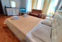 Двуспальная кровать, тумбочки, фен, шкаф, столик, 2 стула, ванная комната (туалет, круглая ванная), жк-телевизор, чайник, вид на море