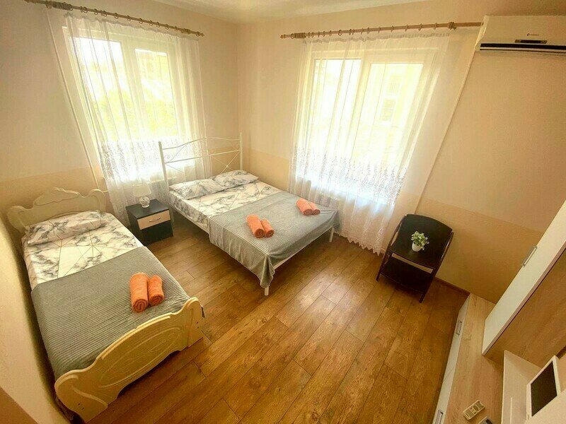 Имеет спальню с приятным интерьером. В номере: 1 двуспальная кровать, 1 односпальная кровать. Имеется телевизор, кондиционер, отопление, вешалка , шкаф, зеркало, москитные сетки на окнах, плотные шторы, на полу ламинат, рабочий стол, журнальный столик, стулья, корзина для мусора. Общая ванная комната: душ, туалет, раковина.
