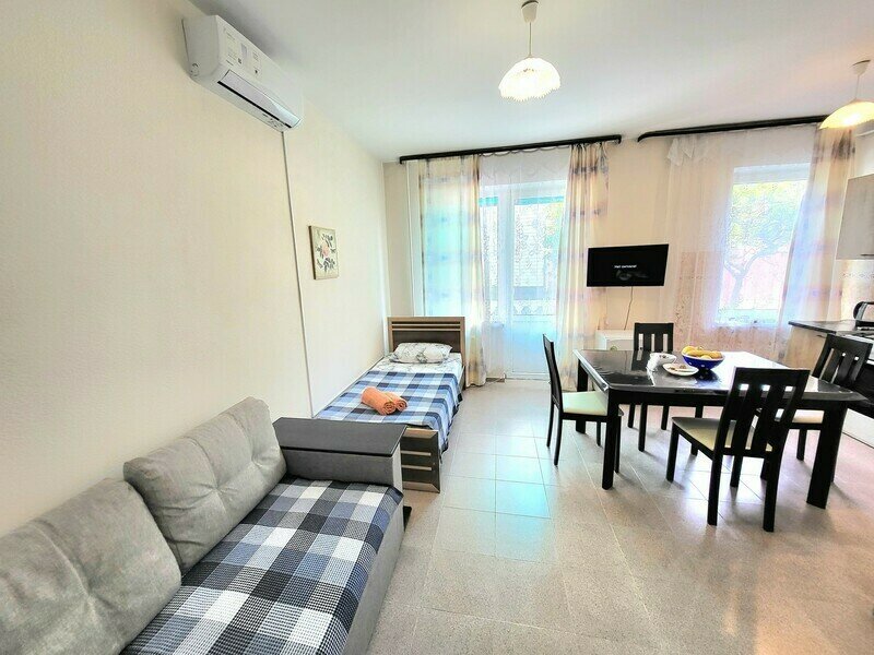 Имеет спальню с приятным интерьером. В номере: 1 диван двуспальный, 1 односпальная кровать. Имеется телевизор, кондиционер, отопление, вешалка , шкаф, москитные сетки на окнах, на полу плитка, обеденный стол, рабочий стол, комод, журнальный столик, кухня, посуда, столовые приборы, чайник, холодильник, газовая плита, Духовой шкаф (духовка), стулья, корзина для мусора. Общая ванная комната: душ, туалет, раковина