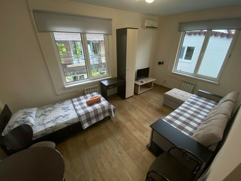 Имеет спальню с приятным интерьером. В номере: 1 диван двуспальный, 1 односпальная кровать. Имеется телевизор, кондиционер, отопление, вешалка , шкаф, зеркало, москитные сетки на окнах, плотные шторы, на полу ламинат, рабочий стол, журнальный столик, стулья, корзина для мусора. Общая ванная комната: душ, туалет, раковина.