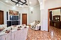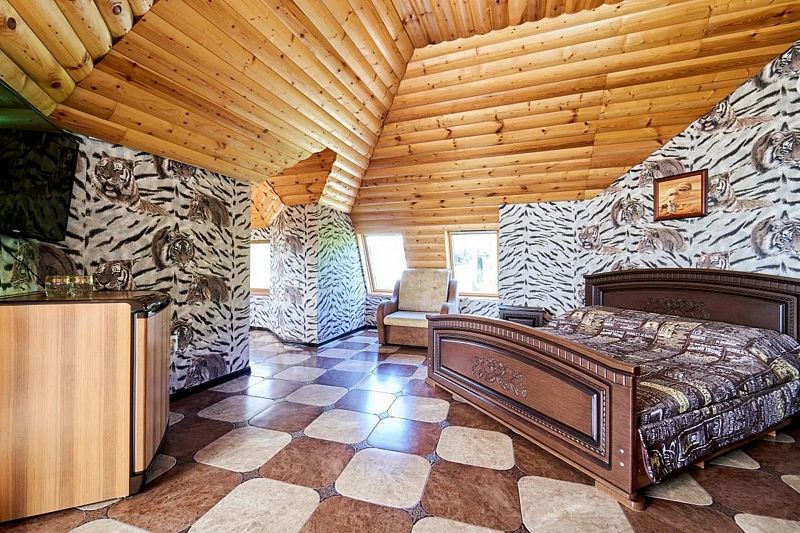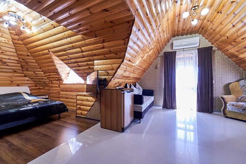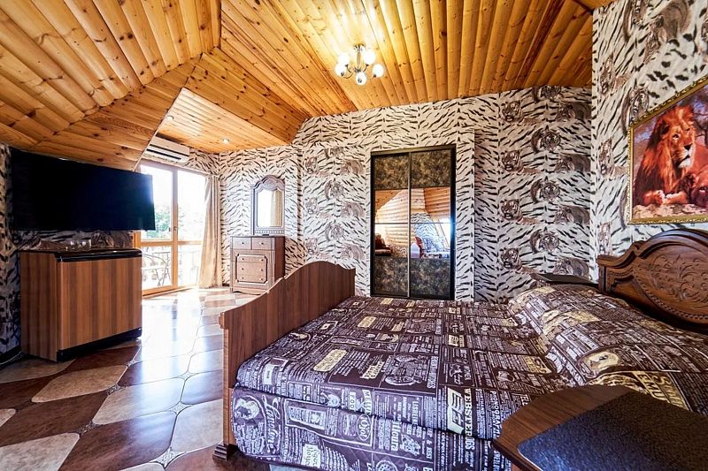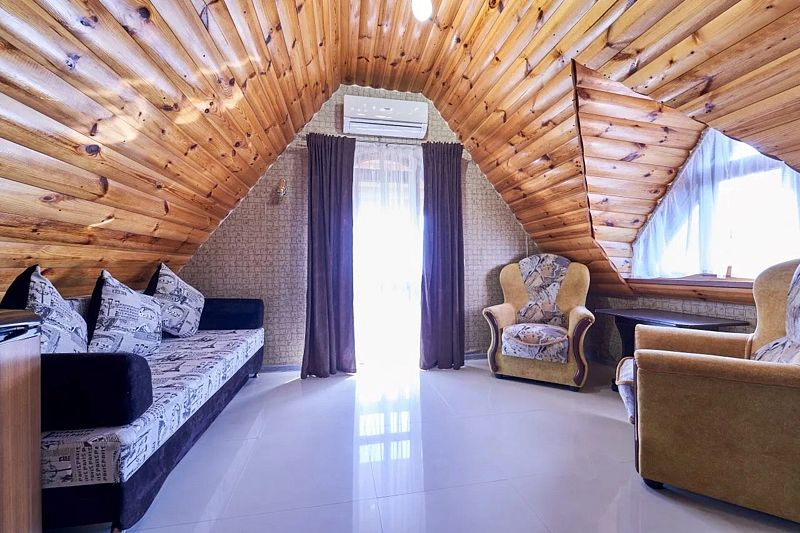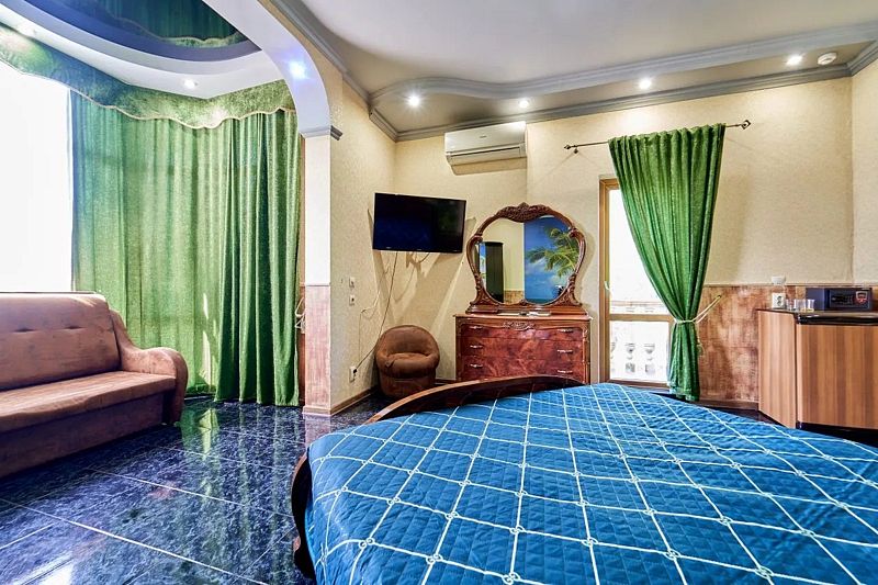 В номере: двуспальная кровать king-size, диван двуспальный. Имеется сейф, телевизор, кондиционер, фен, холодильник, отопление, шкаф, вешалка, журнальный столик, туалетный и комод, стулья, москитная сетка и плотные шторы.