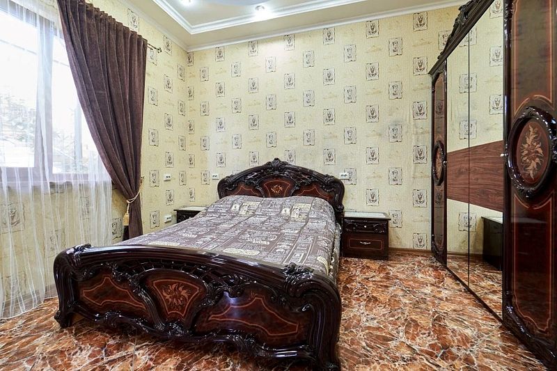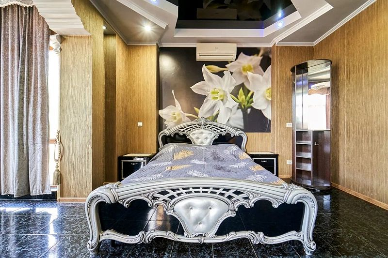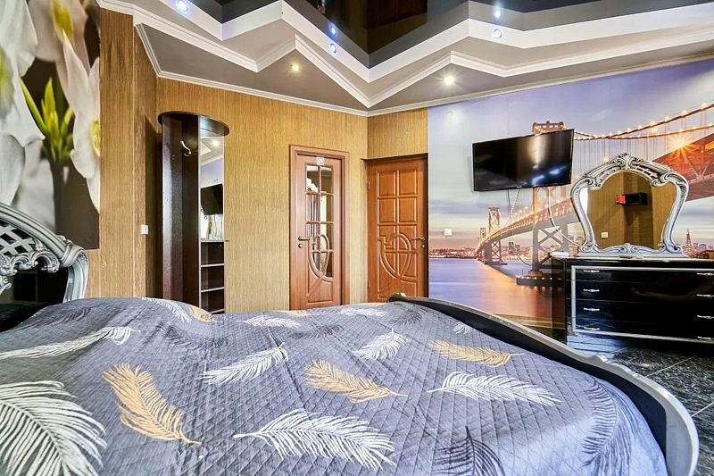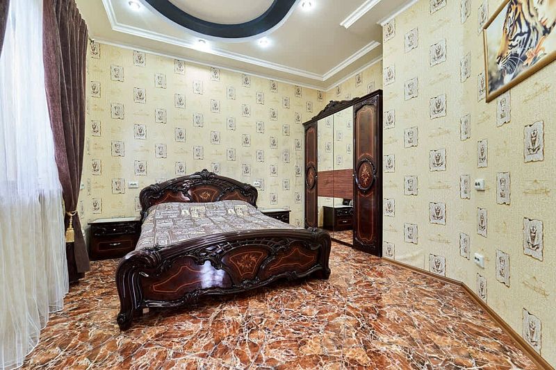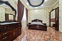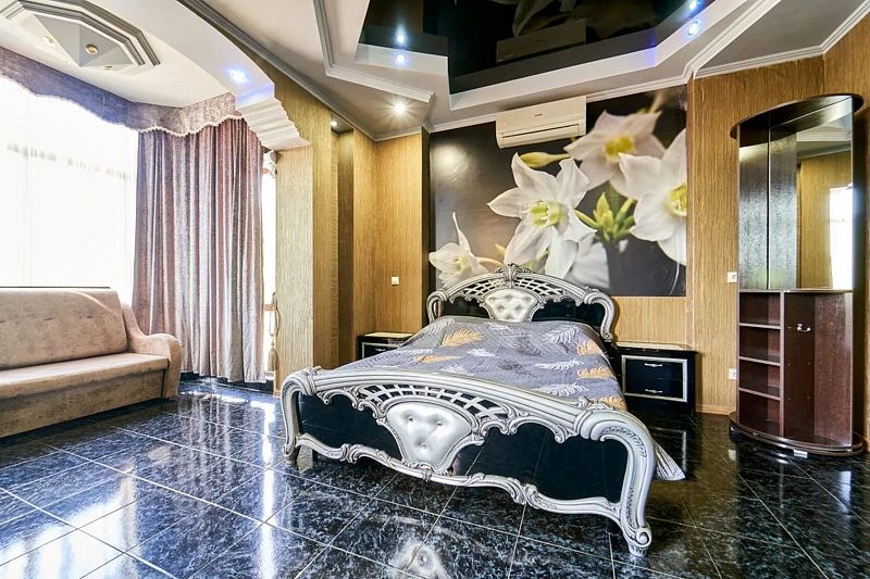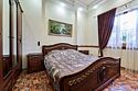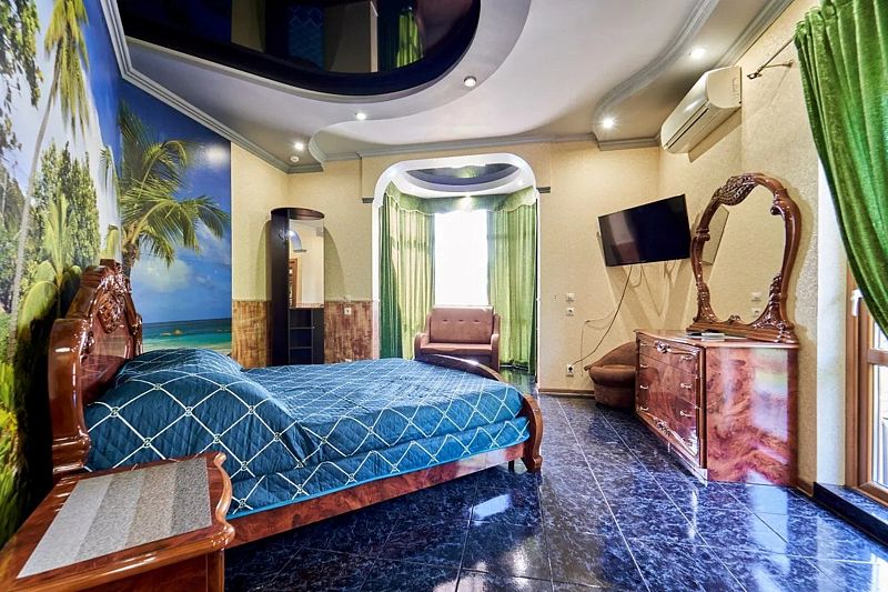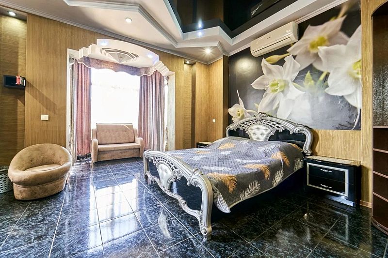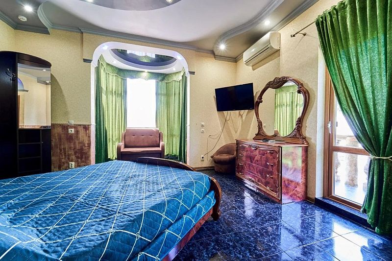 Максимальное количество гостей — 6. В номере гостиная, две спальни, кухня, санузел. В гостиной диван, телевизор, акустика, сейф. В каждой спальне двуспальная кровать, шкаф, комод, прикроватные тумбочки, кондиционер.
