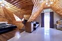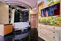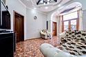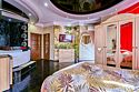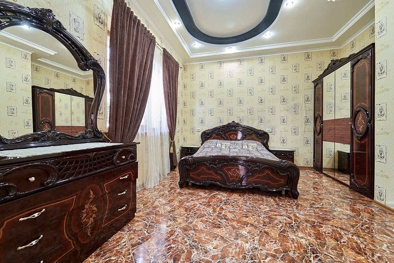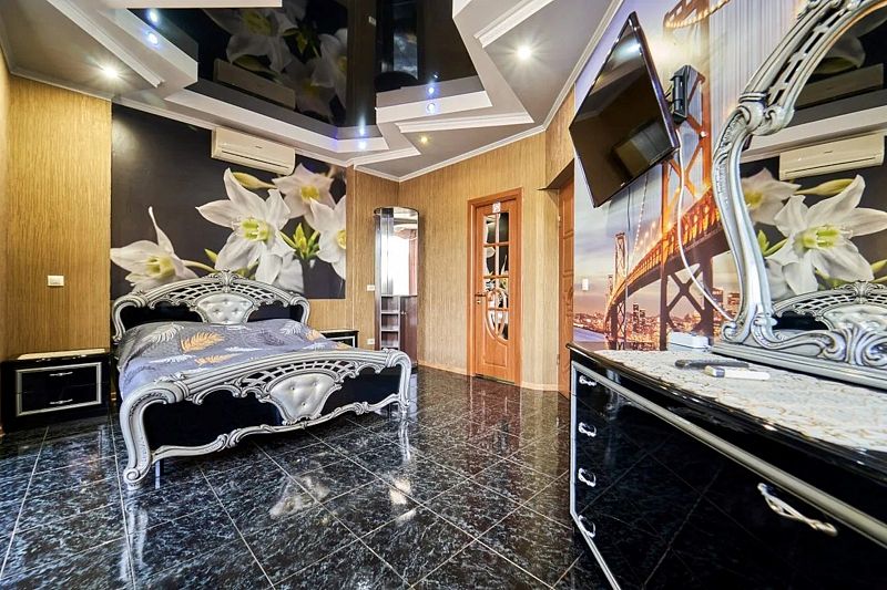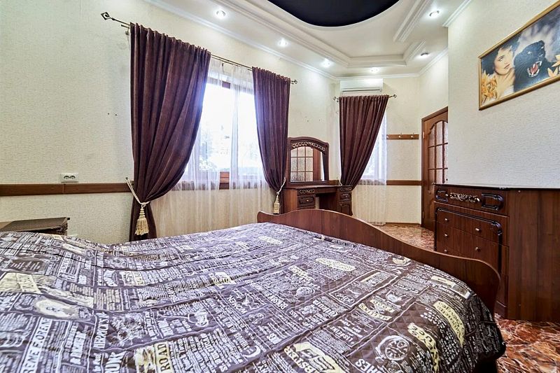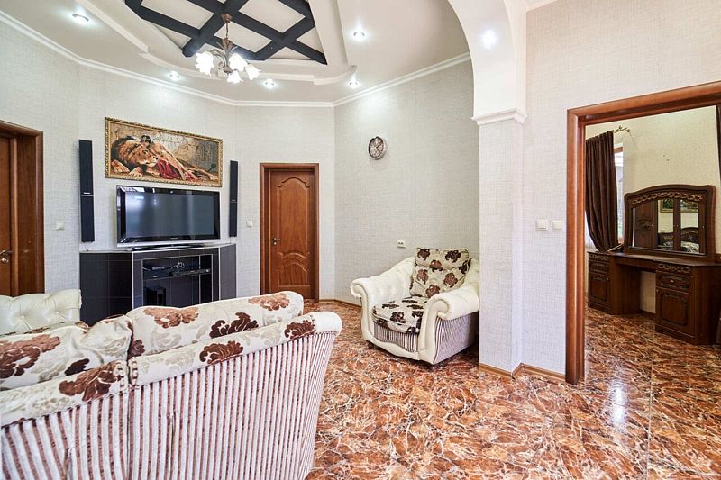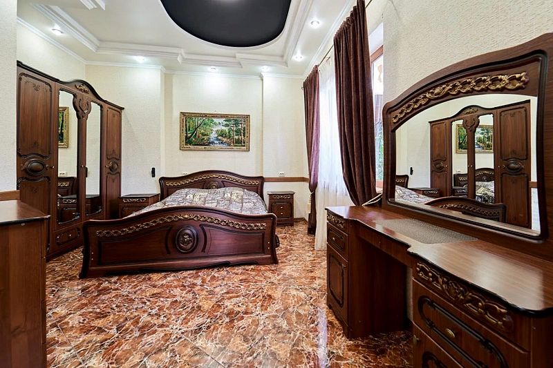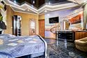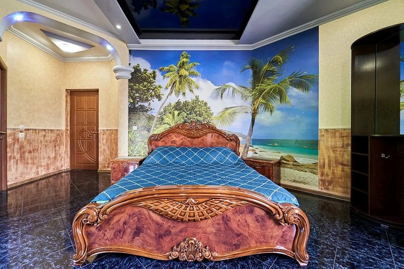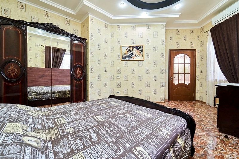 Максимальное количество гостей — 6. В номере гостиная, две спальни, кухня, санузел. В гостиной диван, телевизор, акустика, сейф. В каждой спальне двуспальная кровать, шкаф, комод, прикроватные тумбочки, кондиционер.
