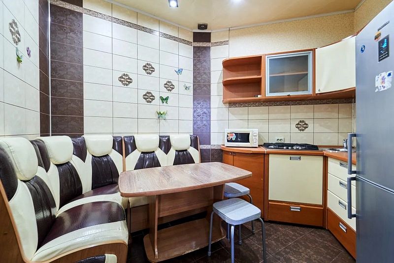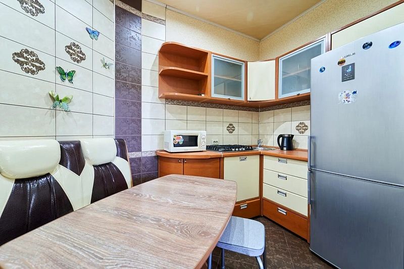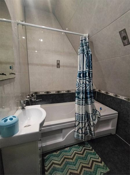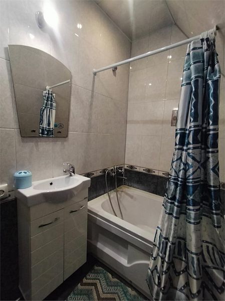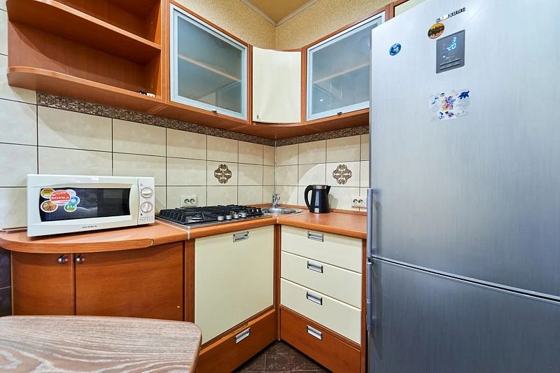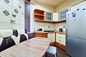 На кухне стол обеденный, табуреты, кухонный гарнитур, газовая плита, чайник, микроволновая печь, холодильник, также вся необходимая посуда для приготовления пищи. Санузел совмещенный. В санузле большая ванна, стиральная машина-автомат.