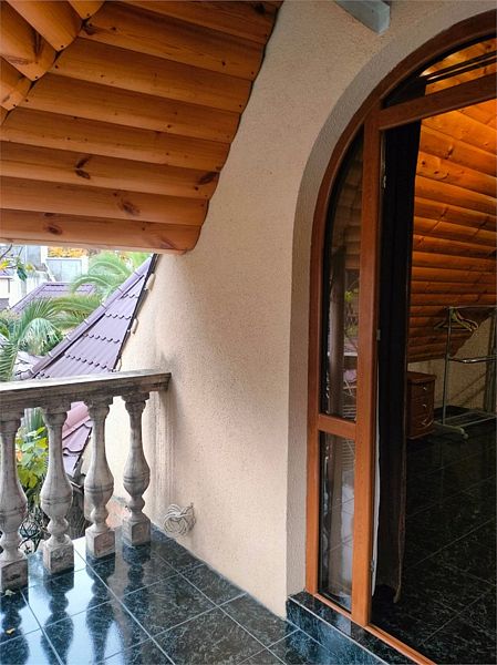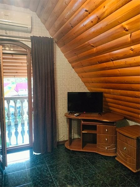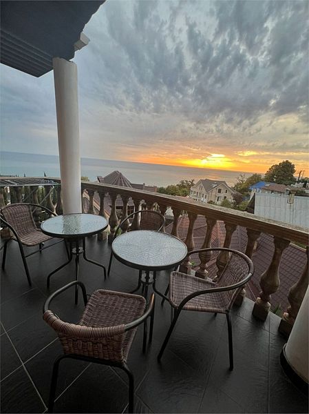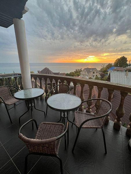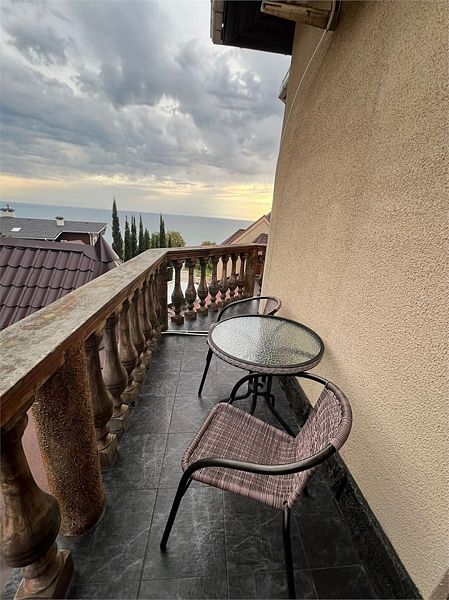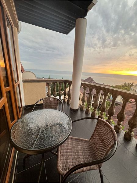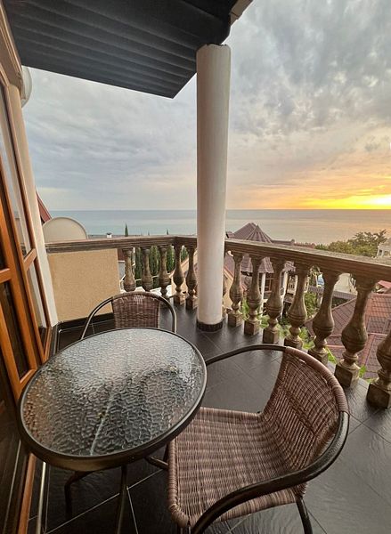 Трехместный улучшенный номер площадью 30 м² с балконом с видом на море. Подходит для размещения 3 человек. Номер с приятным интерьером. Балкон меблирован столом и стульями.