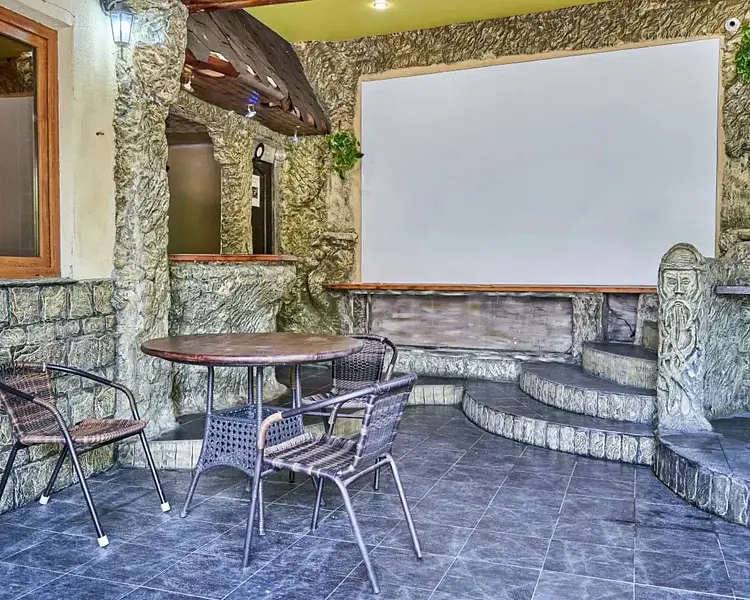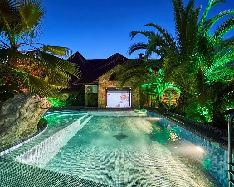 На территории комплекса вас ждет открытый бассейн с подогретой морской водой, где можно приятно освежиться в любое время. Для любителей отдыха на свежем воздухе предусмотрены тихие беседки и зона барбекю с мангалом, идеально подходящая для уютных встреч с друзьями или семьей. Также доступны два кинотеатра — под открытым небом и в уютном помещении, что сделает вечера особенными. Для вашего удобства предусмотрена частная парковка, а в номерах и на всей территории доступен Wi-Fi.