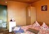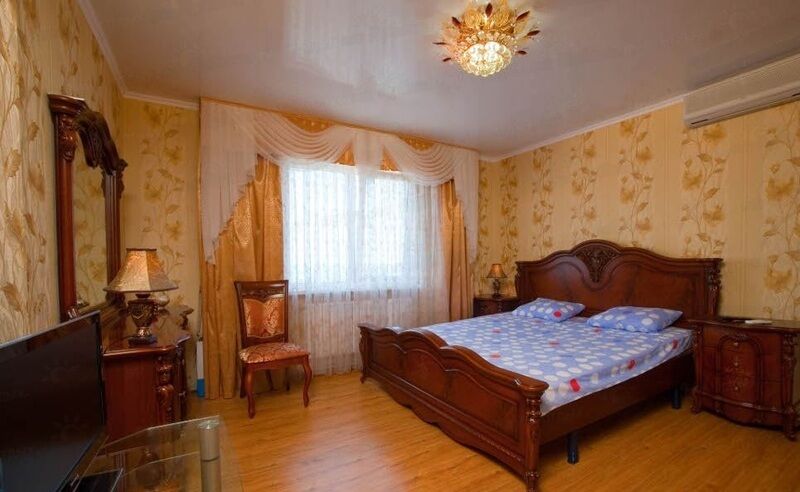 В номере: двуспальная кровать, кресло, прикроватные тумбочки, туалетный столик, зеркало, шкаф, сплит-система, холодильник, телевизор, электрический чайник.