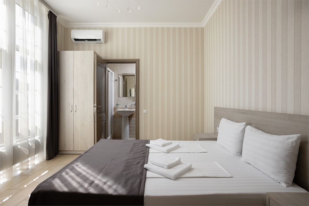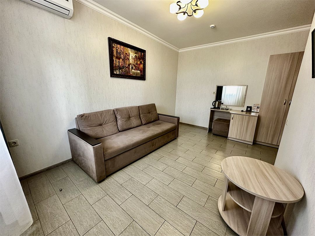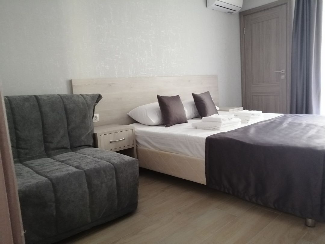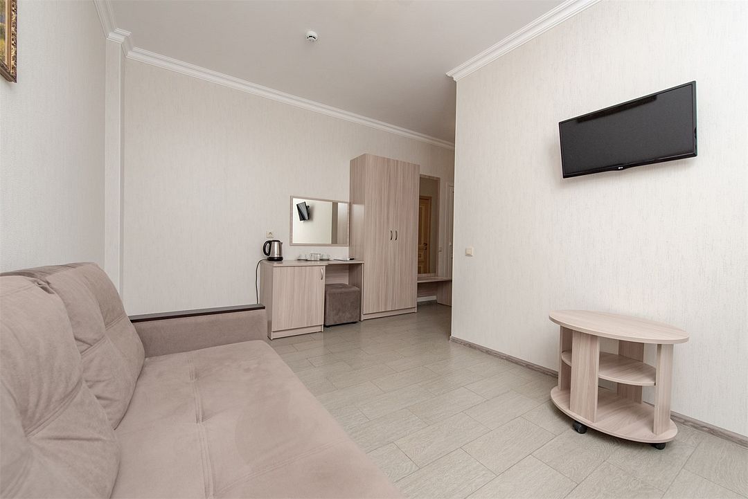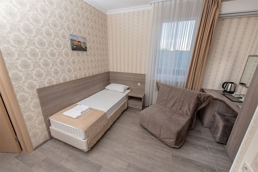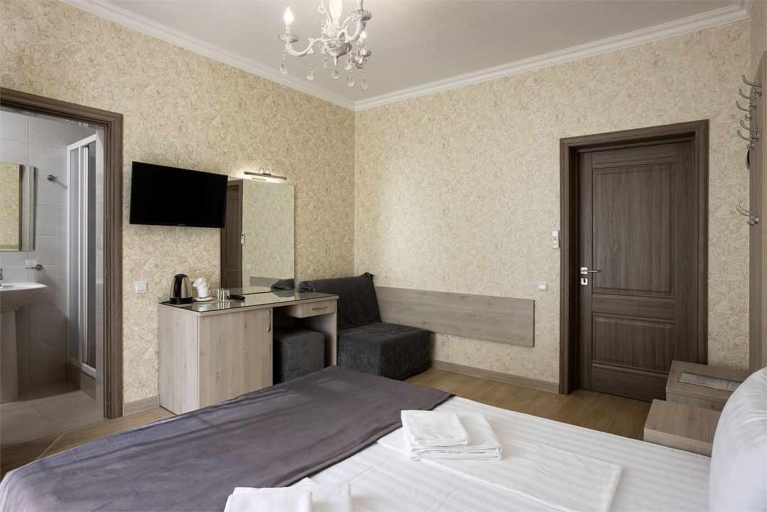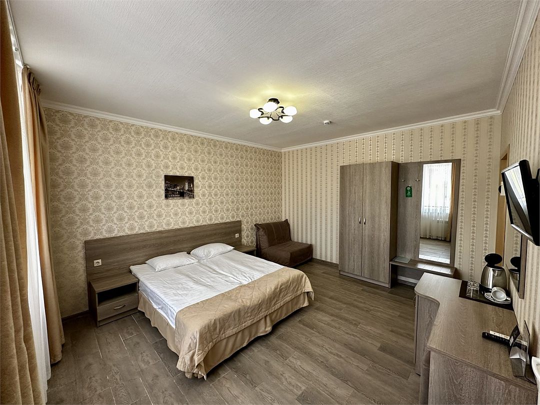Уютный семейный номер для комфортного проживания, без балкона. В номере: двуспальная кровать и раскладное кресло, прикроватные тумбы, пуф, письменный стол, кондиционер, TV. Ванная комната: душ/душевая кабина, санузел, фен, полотенца.Услуги и удобства