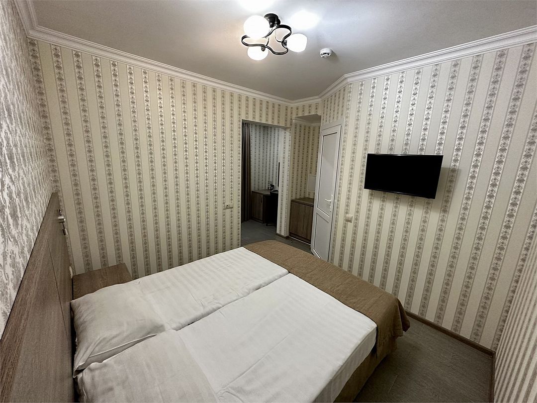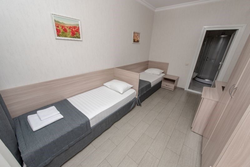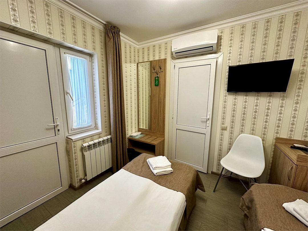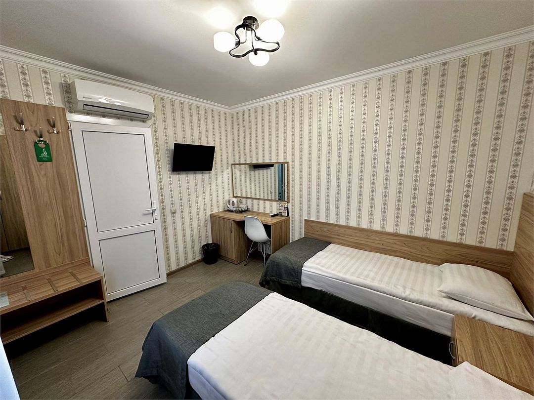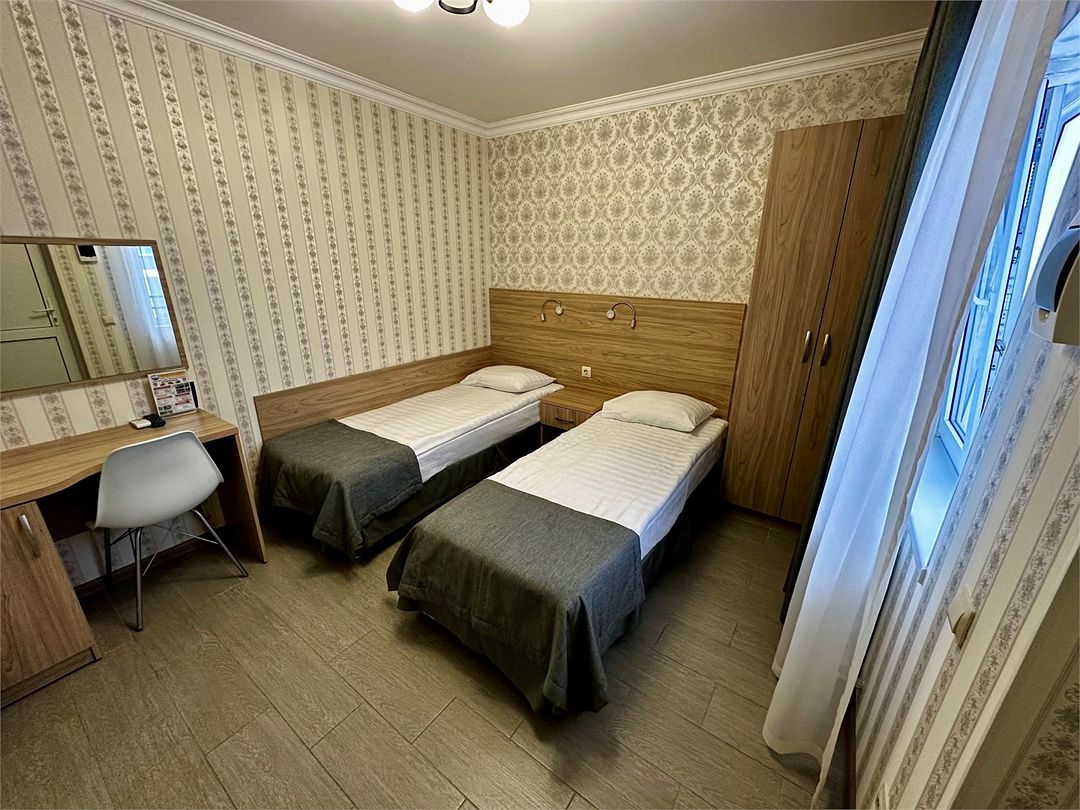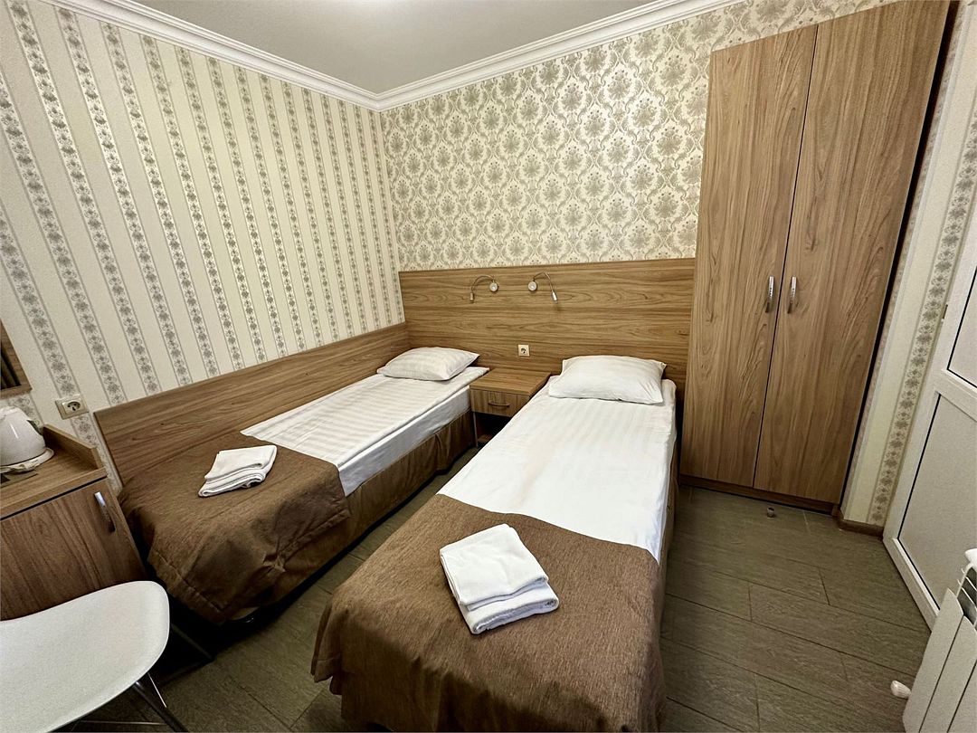 Удобные номера, оснащенные всем необходимым для комфортного проживания, без балкона. В номере : 2 односпальные кровати, прикроватные тумбы, шкаф для одежды, телевизор, кондиционер. Ванная комната: душ, санузел, раковина, фен, полотенца.Услуги и удобства