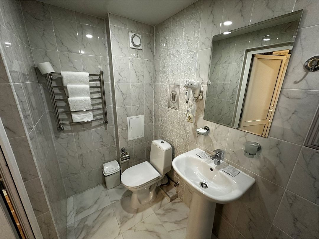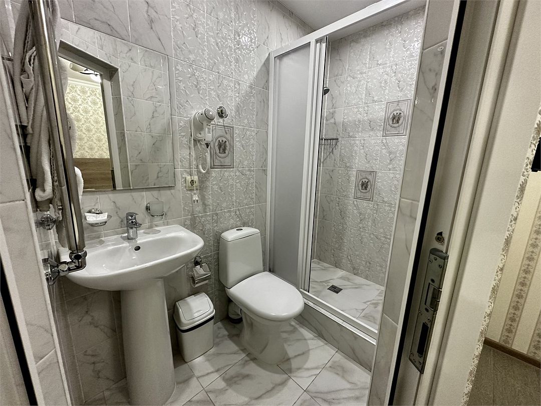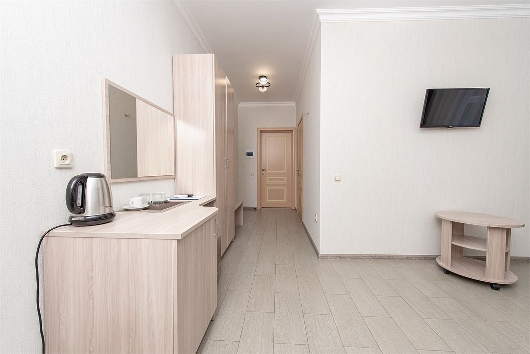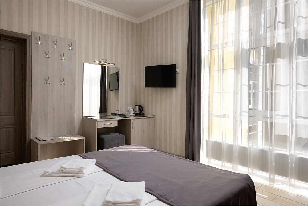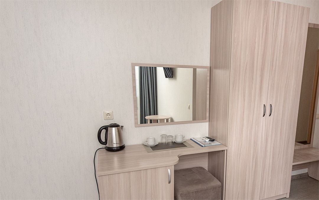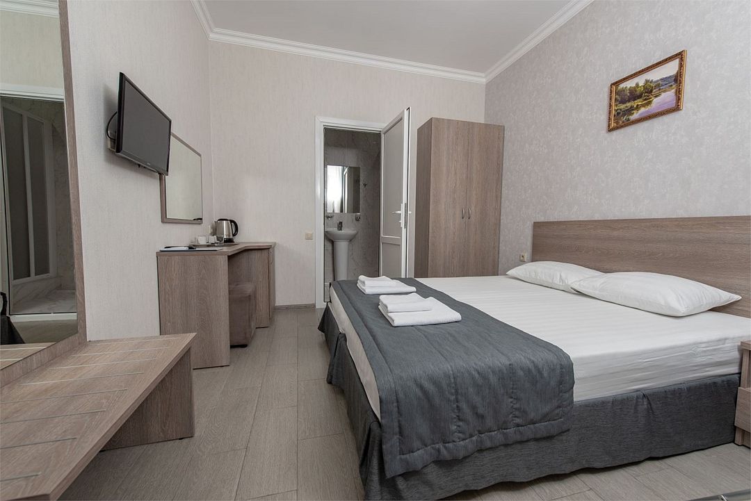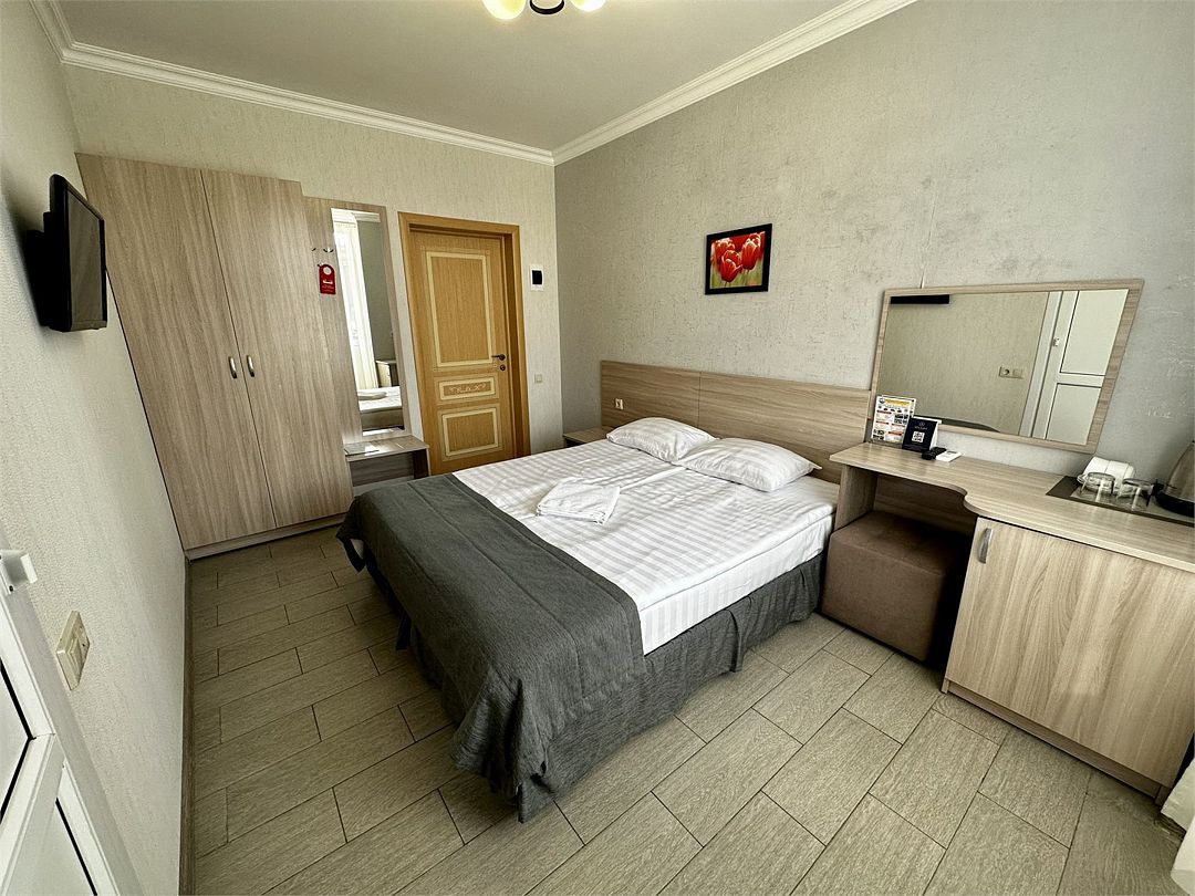 Двухместный, однокомнатный номер без балкона, санузел отдельный в номере (туалет и душ), двуспальная кровать с прикроватными тумбочками, шкаф, туалетный столик, телевизор, холодильник, чайник. Общая площадь номера 12 кв. м.Услуги и удобства