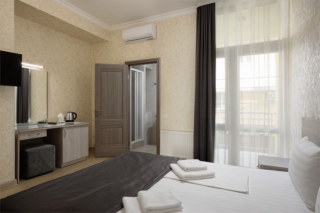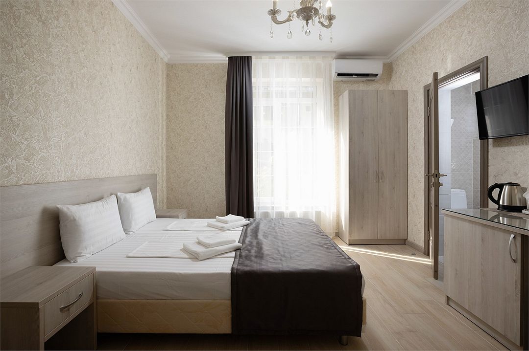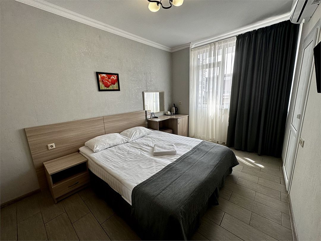 Удобные номера, оснащенные всем необходимым для комфортного проживания, без балкона. В номере : двуспальная кровать, прикроватные тумбы, шкаф для одежды, телевизор, кондиционер. Ванная комната: душ, санузел, раковина, фен, полотенца.Услуги и удобства