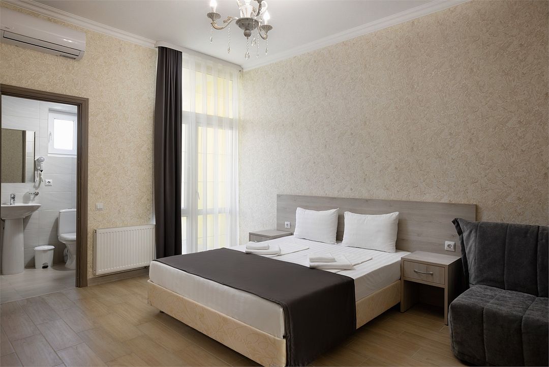 Уютный семейный номер для комфортного проживания, с балконом. В номере: двуспальная кровать и раскладное кресло, прикроватные тумбы, пуф, письменный стол, кондиционер, TV. Ванная комната: душ, санузел, раковина, фен, полотенца.Услуги и удобства