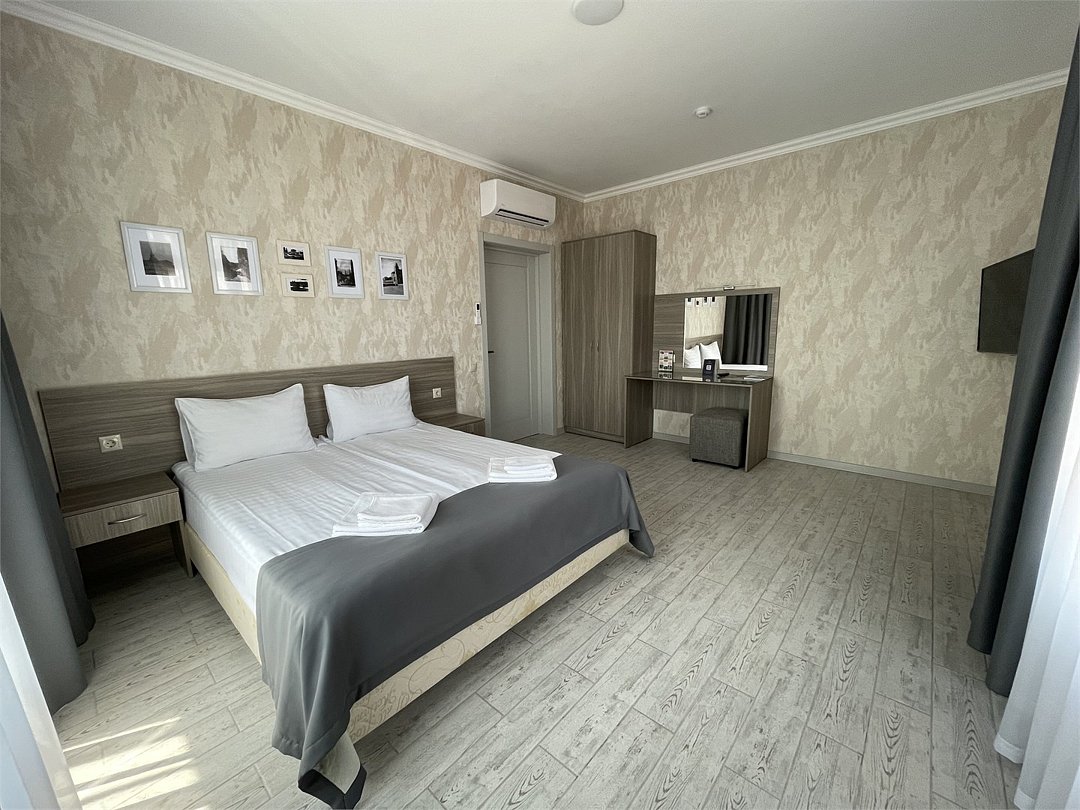 Двухместный, однокомнатный номер, двуспальная кровать с прикроватными тумбочками, шкаф, туалетный столик, зеркало, пуф, телевизор, кондиционер, стул, мини-холодильник. Ванная комната: душ, санузел, раковина, фен, полотенца.Услуги и удобства