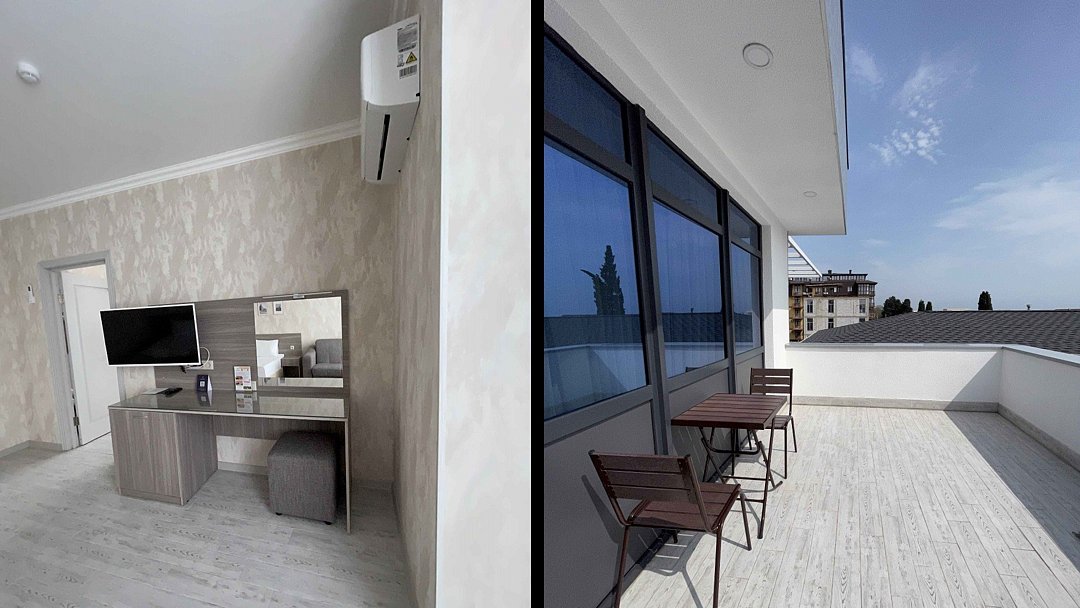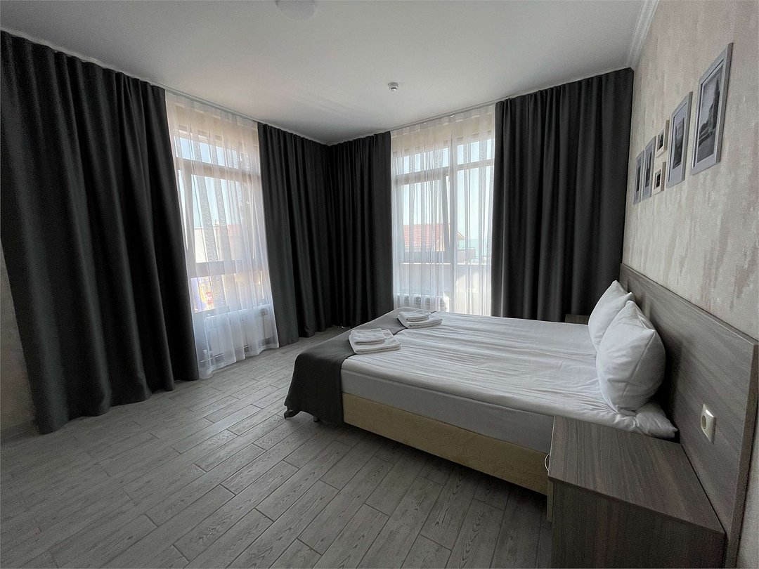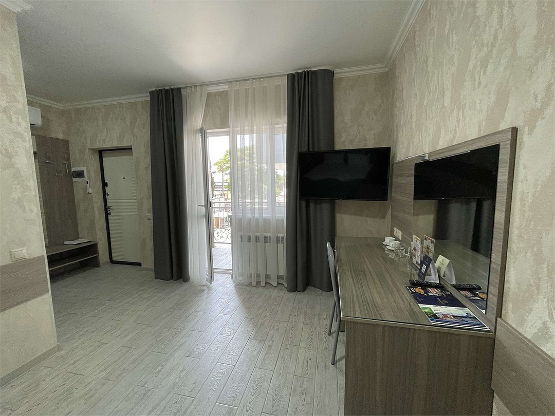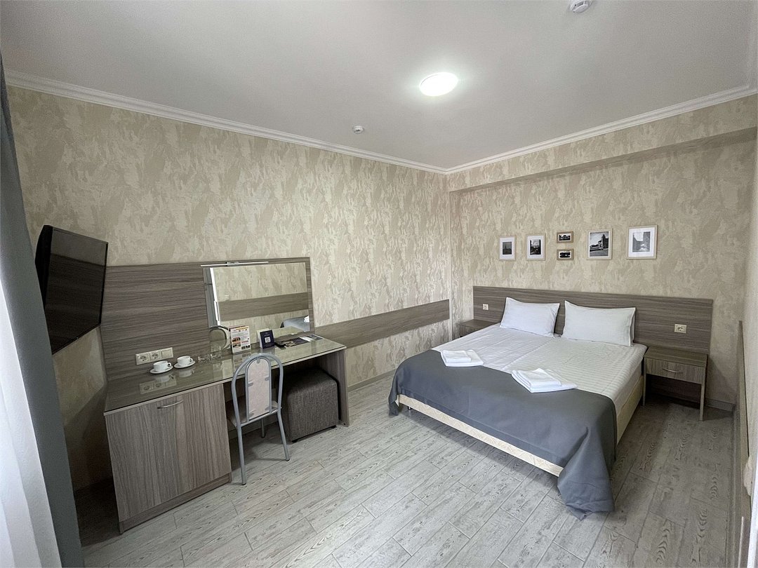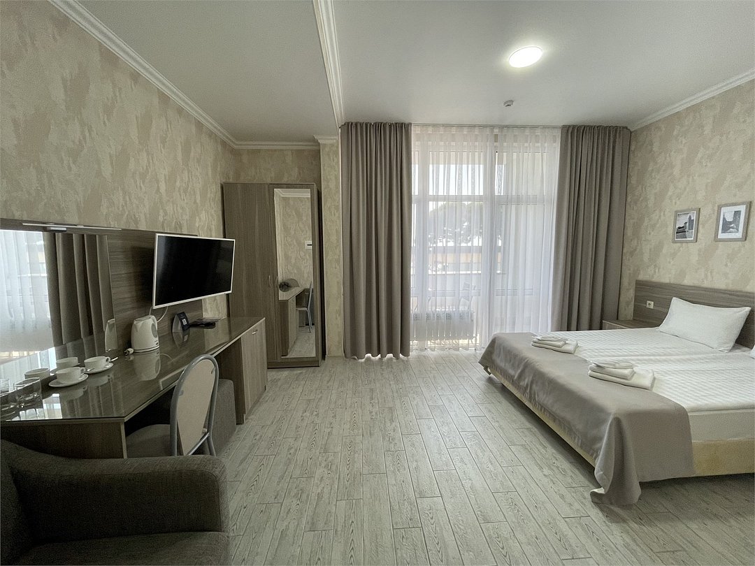 Двухместный, однокомнатный номер с балконом. Двуспальная кровать с прикроватными тумбочками, шкаф, туалетный столик, зеркало, пуф, телевизор, кондиционер, стул, мини-холодильник. Ванная комната: душ, санузел, раковина, фен, полотенца.Услуги и удобства