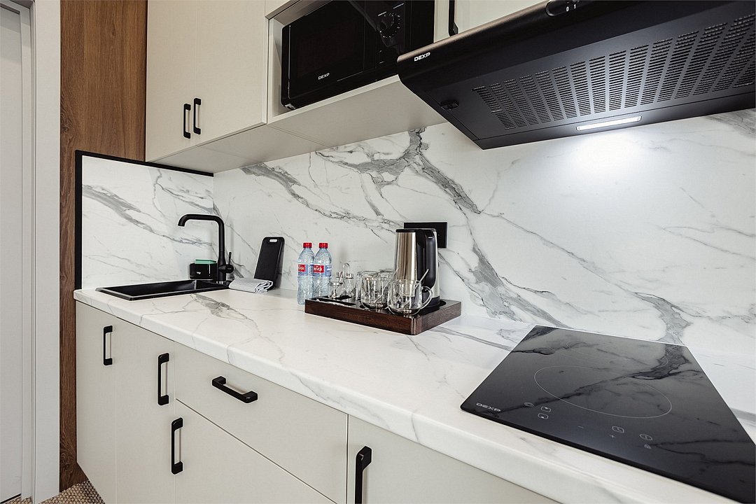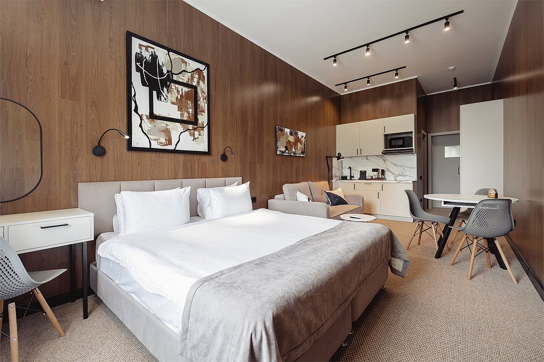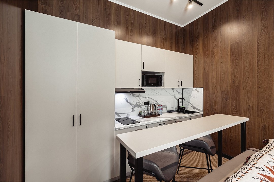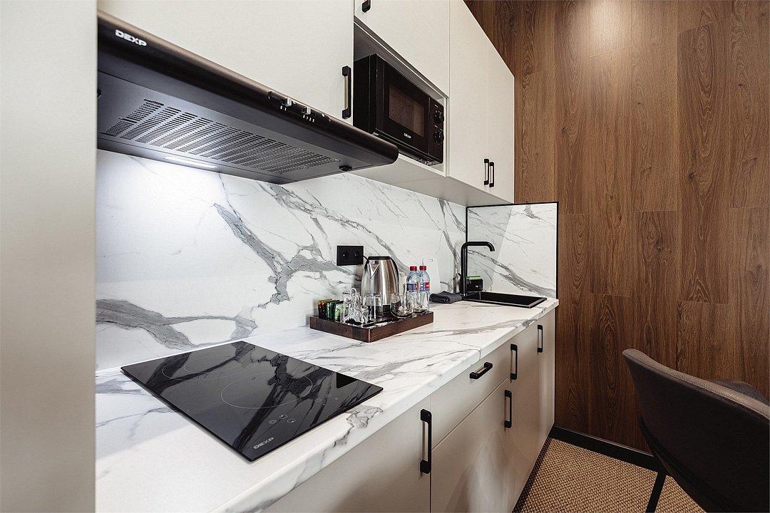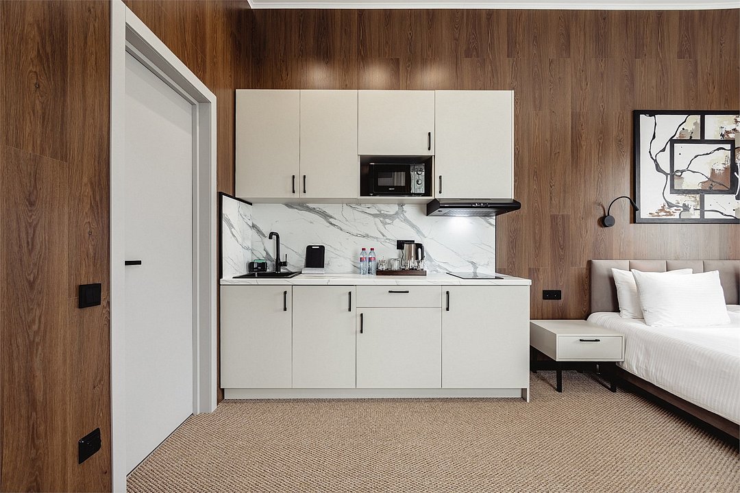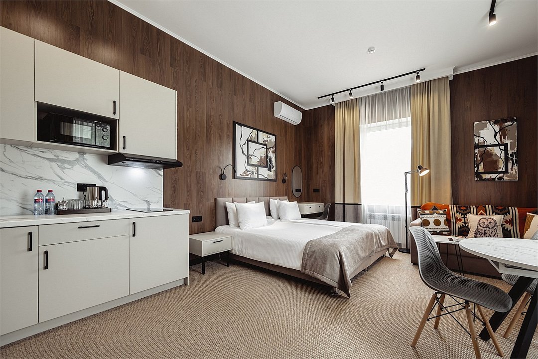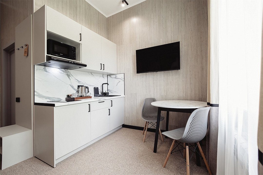 Дизайнерские светлые номера с кухней (варочная панель, микроволновая печь, холодильник, посуда, столовые приборы, чайная станция).Услуги и удобства