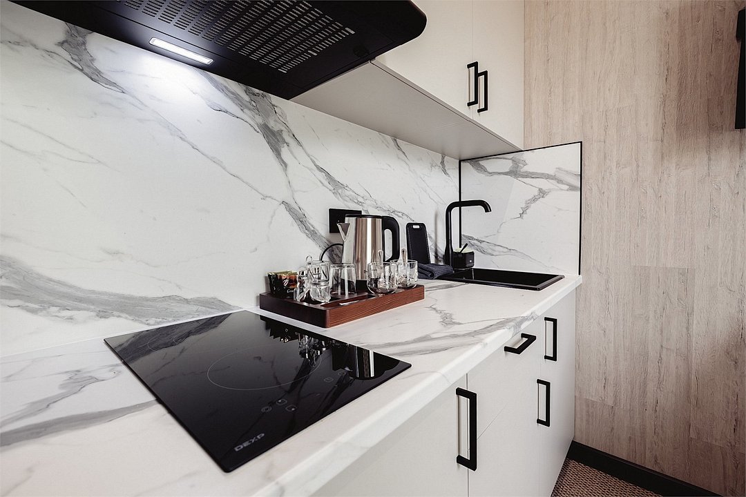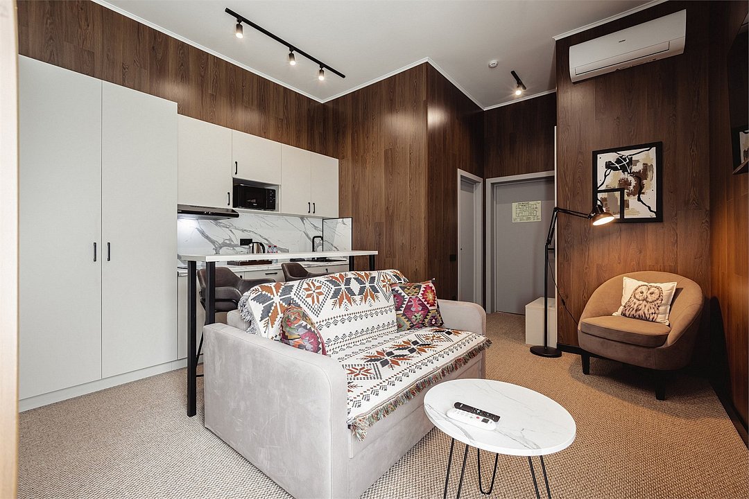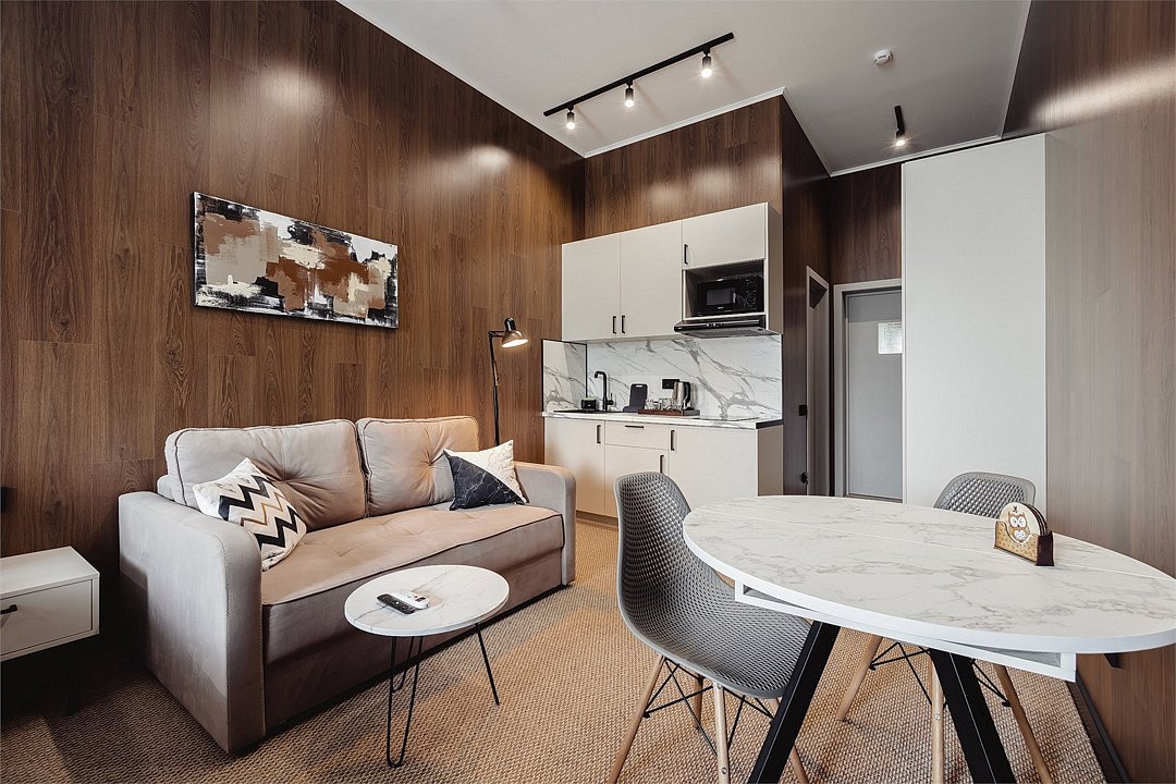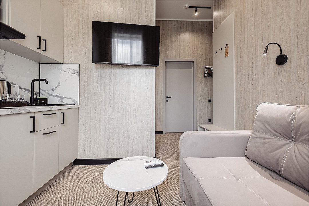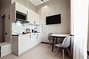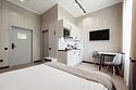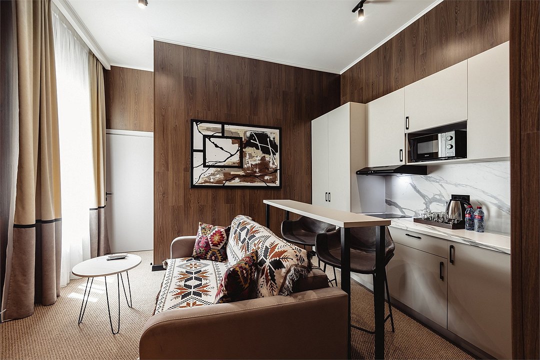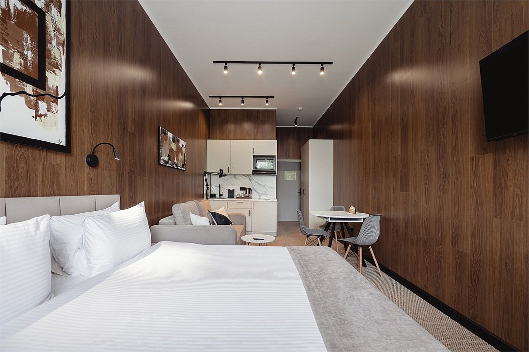 Дизайнерские светлые номера с кухней (варочная панель, микроволновая печь, холодильник, посуда, столовые приборы, чайная станция).Услуги и удобства
