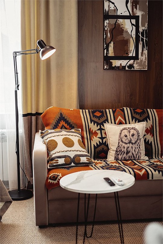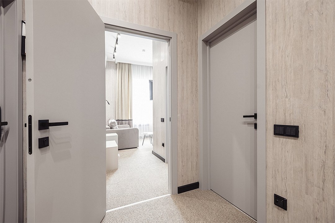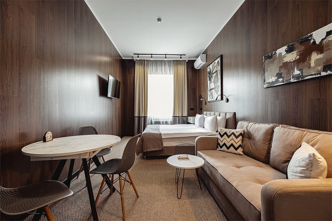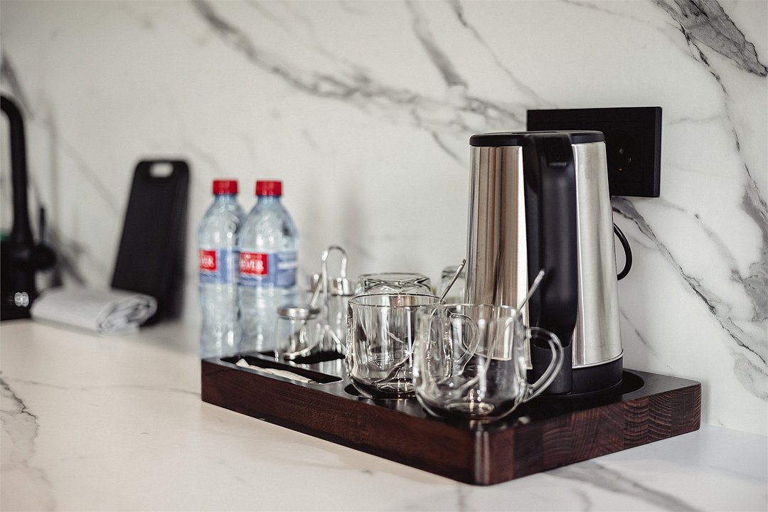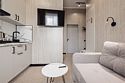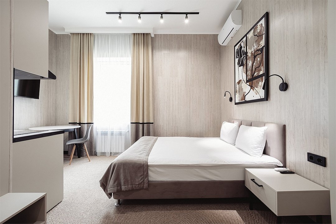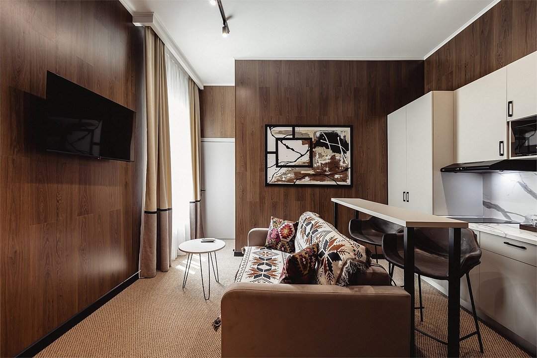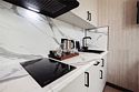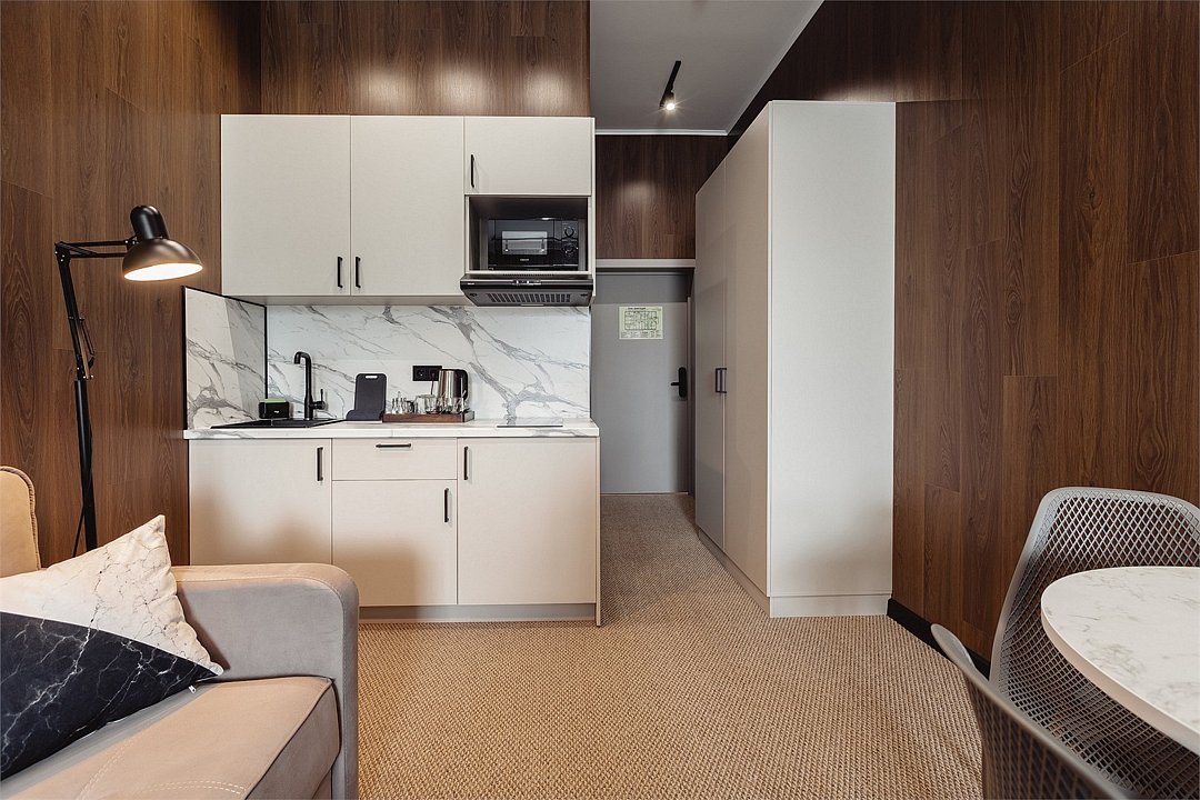 Дизайнерские светлые номера с кухней (варочная панель, микроволновая печь, холодильник, посуда, столовые приборы, чайная станция).Услуги и удобства