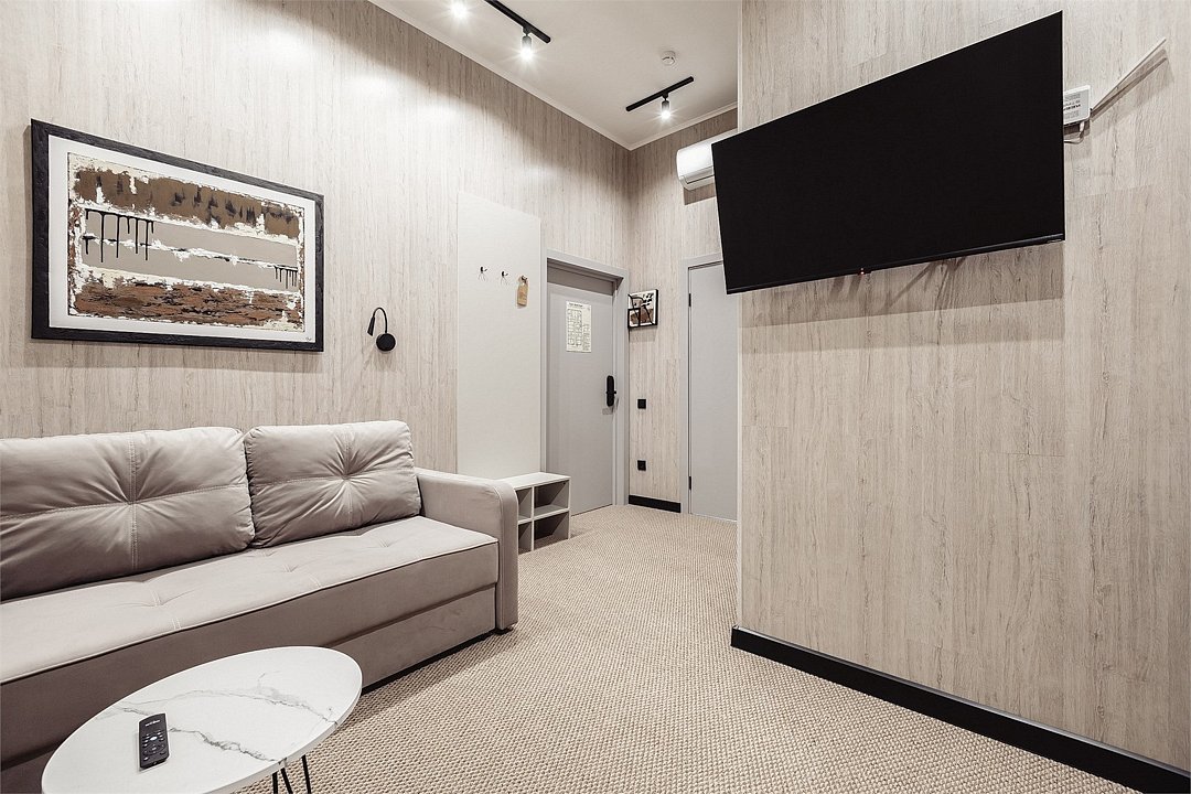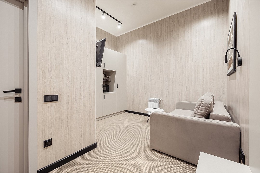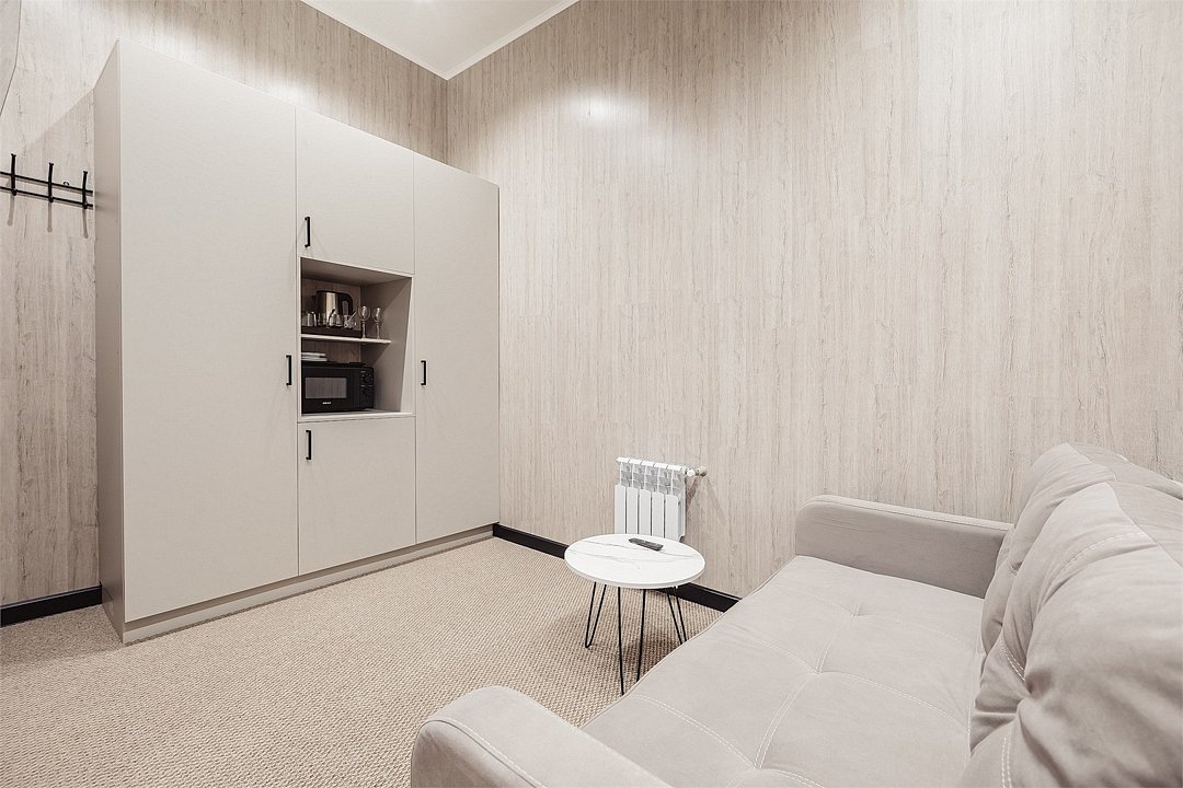 Уютный однокомнатный номер с мини-кухней , спальное место диван-кровать ( раскладной диван, размер 1400* 1800) . Душевая комната, высокие потолки. Чайная станция, микроволновая печь, холодильник. Номера «Стандарт» и «Стандарт БЕЗ дневного освещения» являются смежными номерами (коннектами) и соединены между собой межкомнатной дверью. При бронировании одного из номеров, обратите внимание на повышенный уровень слышимости.Услуги и удобства