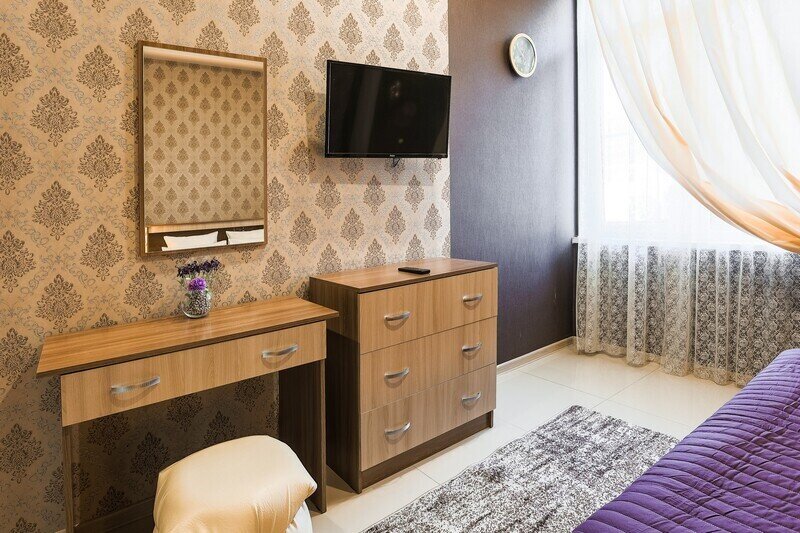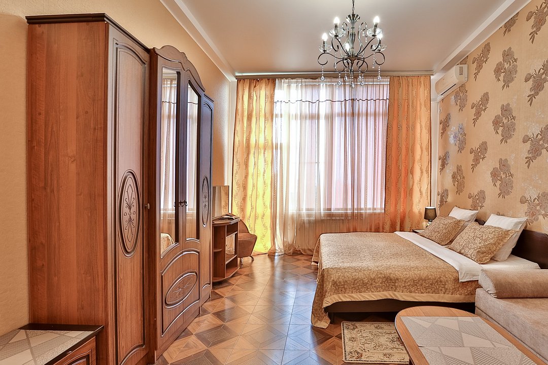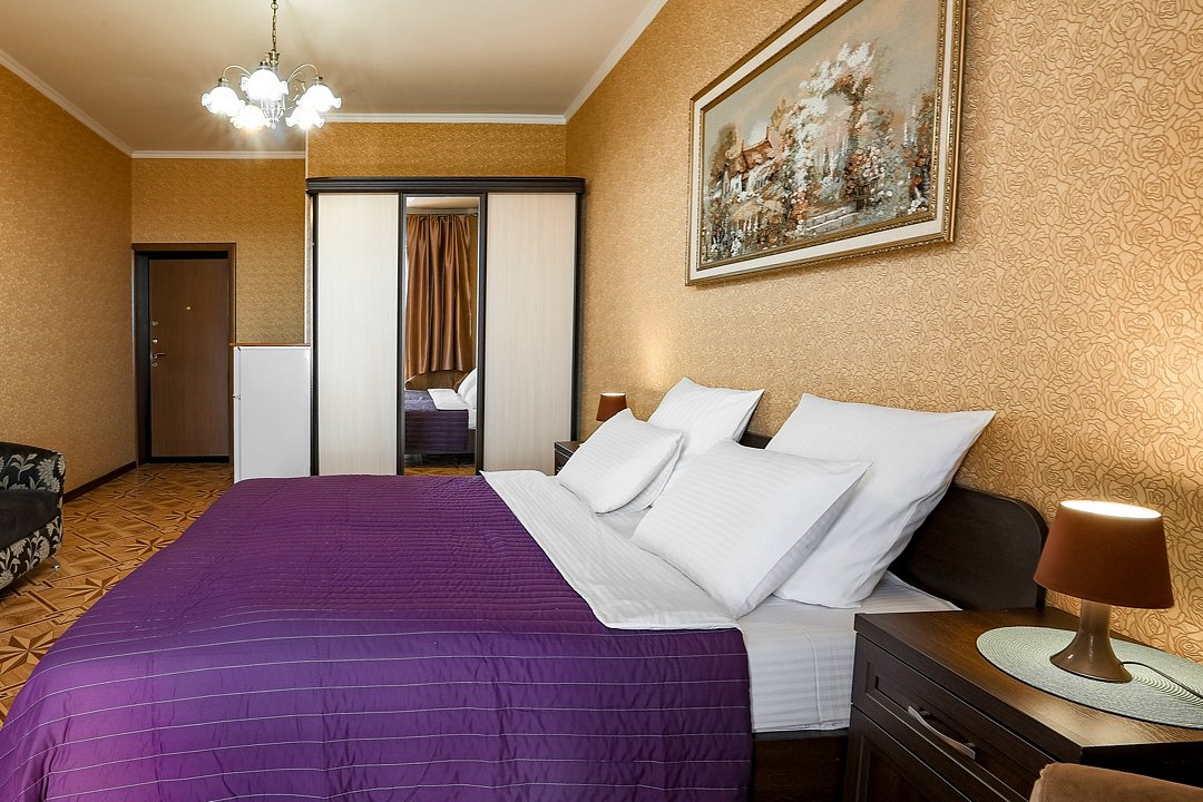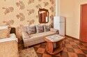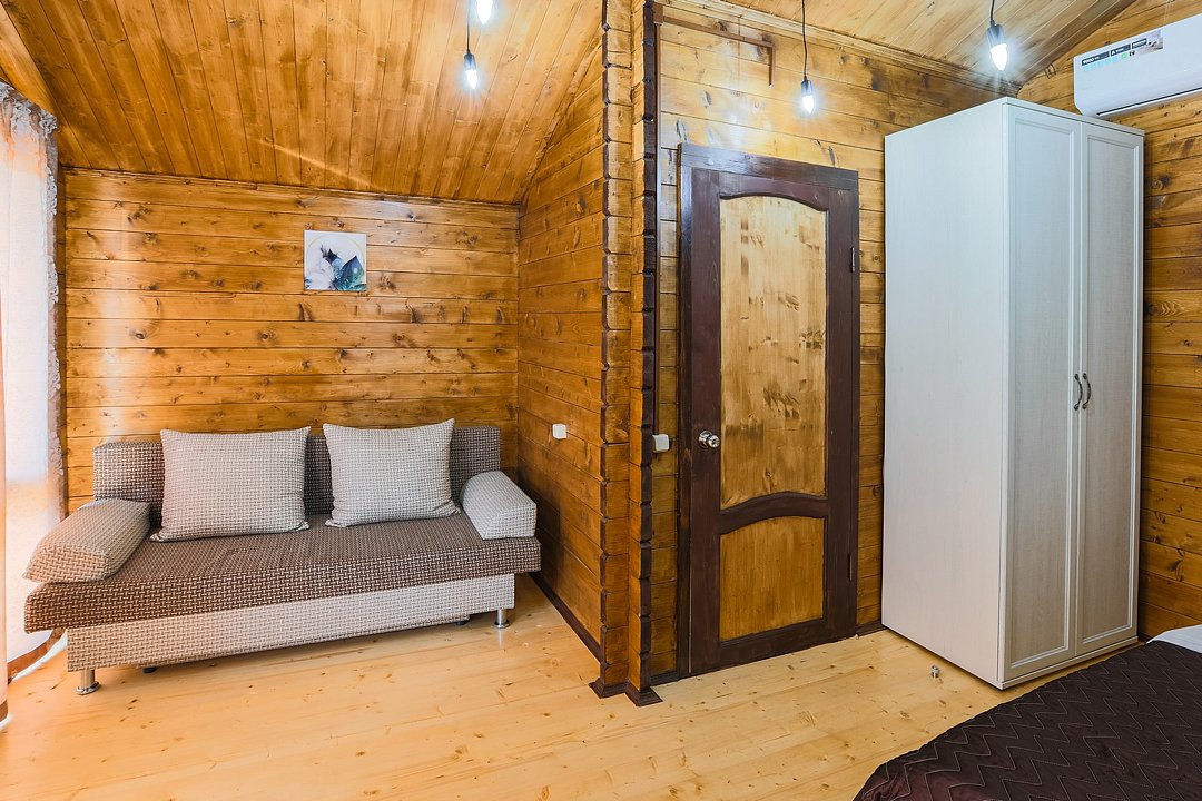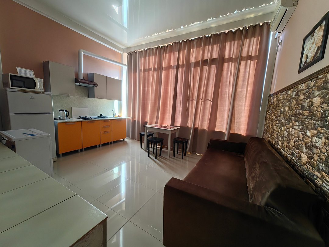 В номере: 1 двуспальная кровать, 1 двуспальный диван. Имеется телевизор, кондиционер, фен, шкаф, вешалка, журнальный столик, стулья, комод, холодильник, газовая плита, чайник, посуда, столовые приборы. Индивидуальная ванная комната: ванна, раковина, туалет. В стоимость входит: Постельное бельё, полотенца. WI-Fi бесплатно на всей территории. Платная парковка на территории.