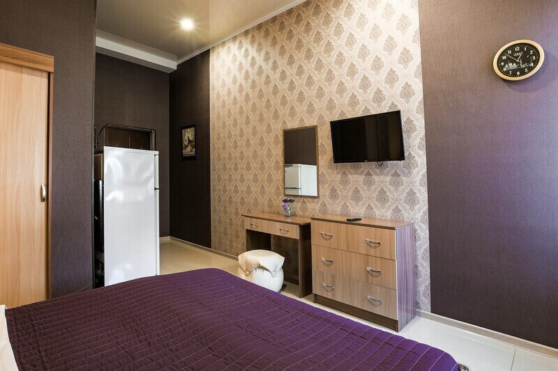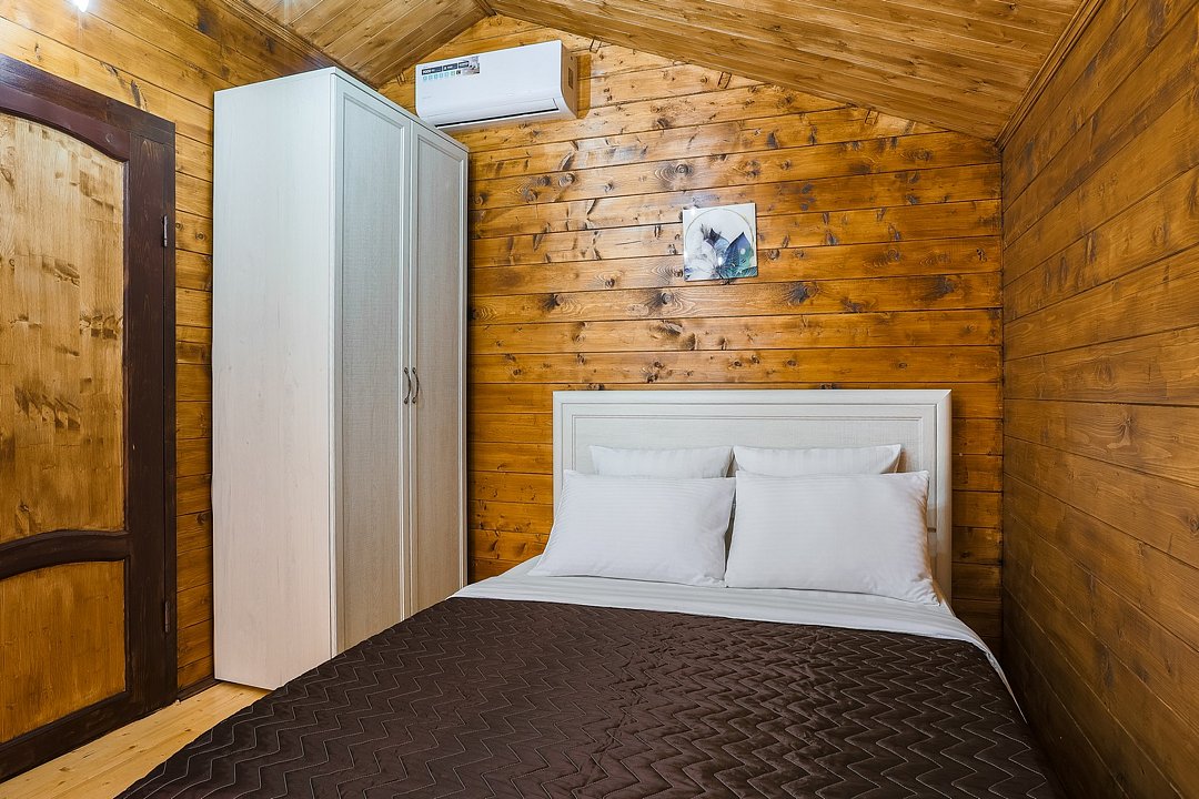 В номере: 1 двуспальная кровать. Имеется телевизор, кондиционер, отопление, фен, шкаф, вешалка, стол обеденный, рабочий, комод, стулья, холодильник, газовая плита, чайник, посуда, столовые приборы. Индивидуальная ванная комната: ванна, раковина, туалет. В стоимость входит: Постельное бельё, полотенца. WI-Fi бесплатно на всей территории. Платная парковка на территории.