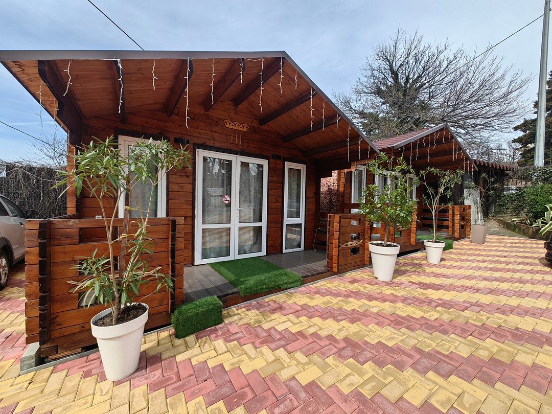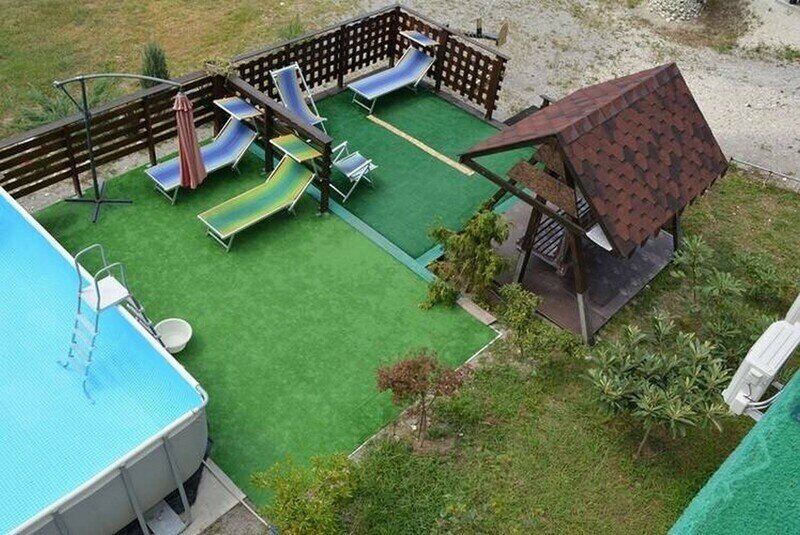 Семейный отдыхДостоинстваПровели здесь почти 2 недели. Несмотря на пик сезона, хозяева тепло встретили и помогли с размещением. Они всегда на месте и решают любые вопросы. На территории большой бассейн, беседка, мангал и небольшой сад для детских игр. Мы жили в отдельном деревянном домике, где было чисто и уютно. Можно готовить на общей кухне или в номере. В домике есть холодильник, телевизор, мебель. Ванная комната с небольшой ванной, что удобнее душевых кабин. Лучше приезжать сюда на машине, есть своя парковка.