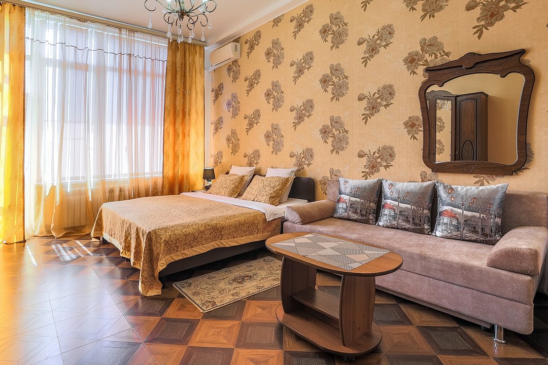 Апартамент-студия без балкона площадью 34 кв.м с видом во двор. Подходит для размещения 4 человек. Апартаменты с приятным интерьером.