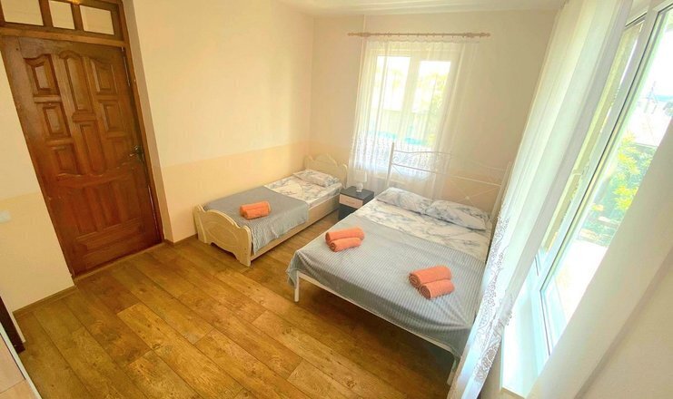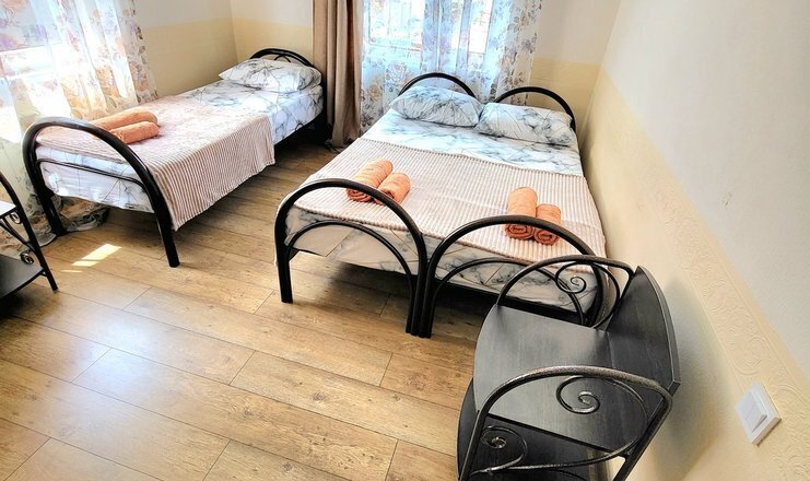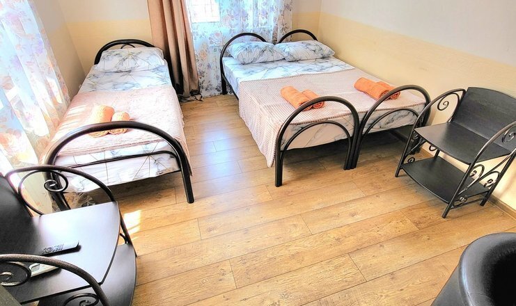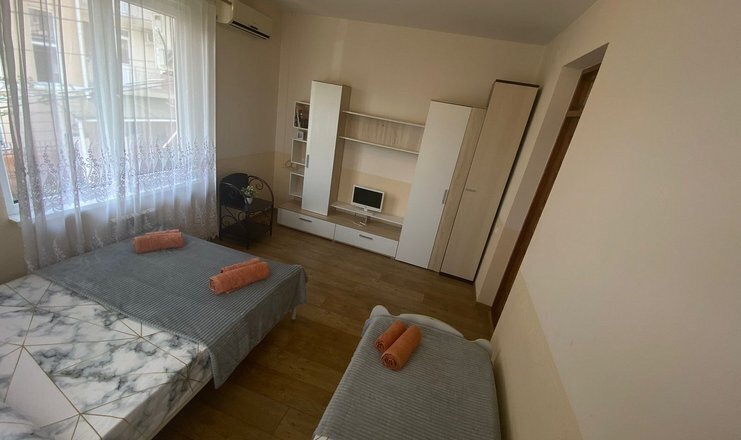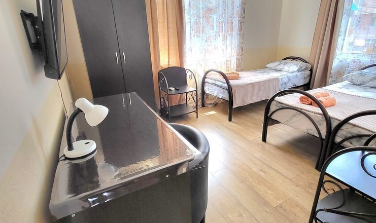 В номере: 1 двуспальная кровать, 1 односпальная кровать. Имеется SMART телевизор, кондиционер, отопление, вешалка, шкаф, зеркало, москитные сетки на окнах, плотные шторы, на полу ламинат, рабочий стол, журнальный столик, стулья, корзина для мусора. Общая ванная комната: душ, туалет, раковина.