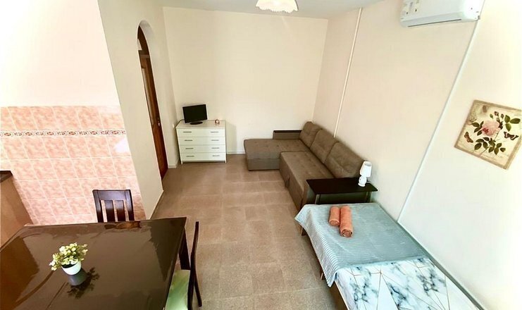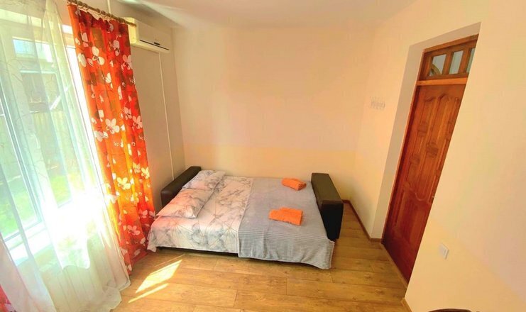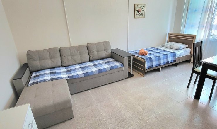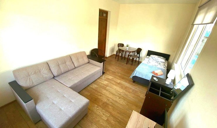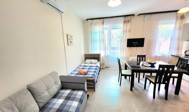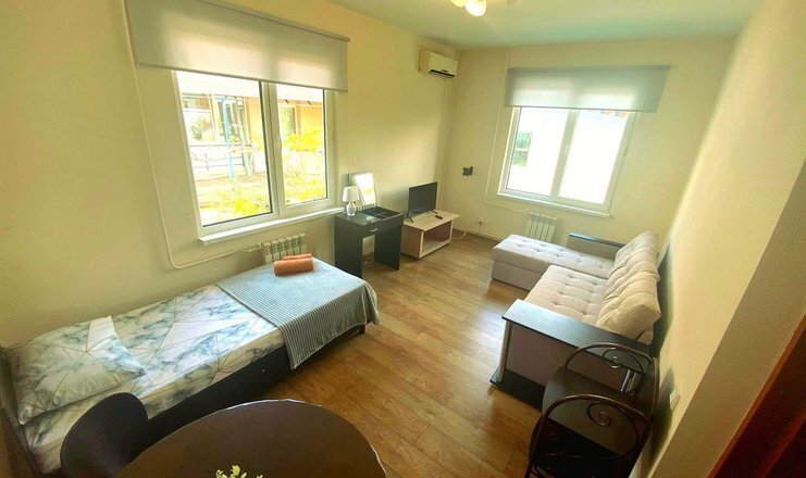 Студио площадью 25 кв.м с видом во двор и отдельным выходом на террасу. Подходит для размещения 4 человек Имеет спальню с приятным интерьером.