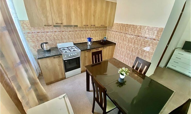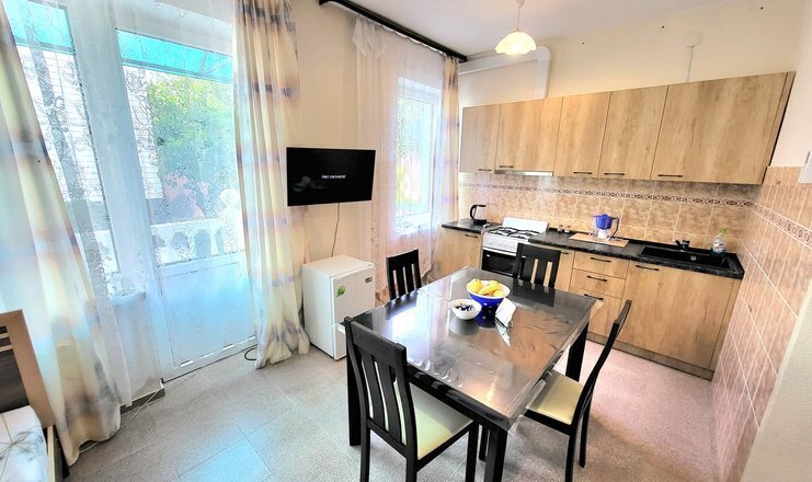 В номере: 1 двуспальная кровать, 2 односпальные кровати. Имеется SMART телевизор, кондиционер, отопление, вешалка, шкаф, обеденный стол, комод, кухня, посуда, столовые приборы, чайник, холодильник, газовая плита, микроволновая печь, стулья.