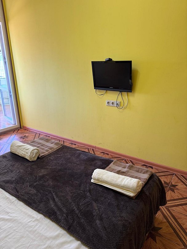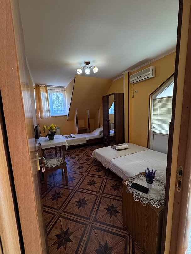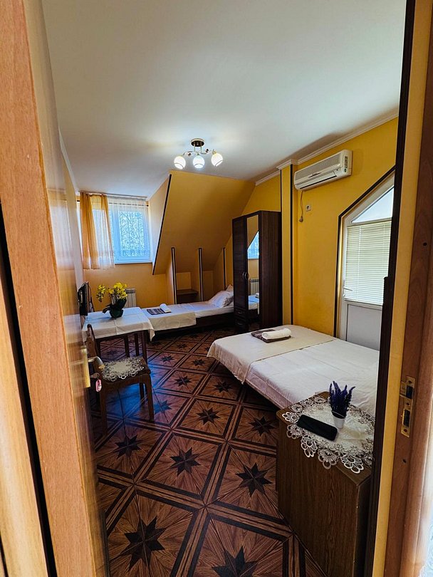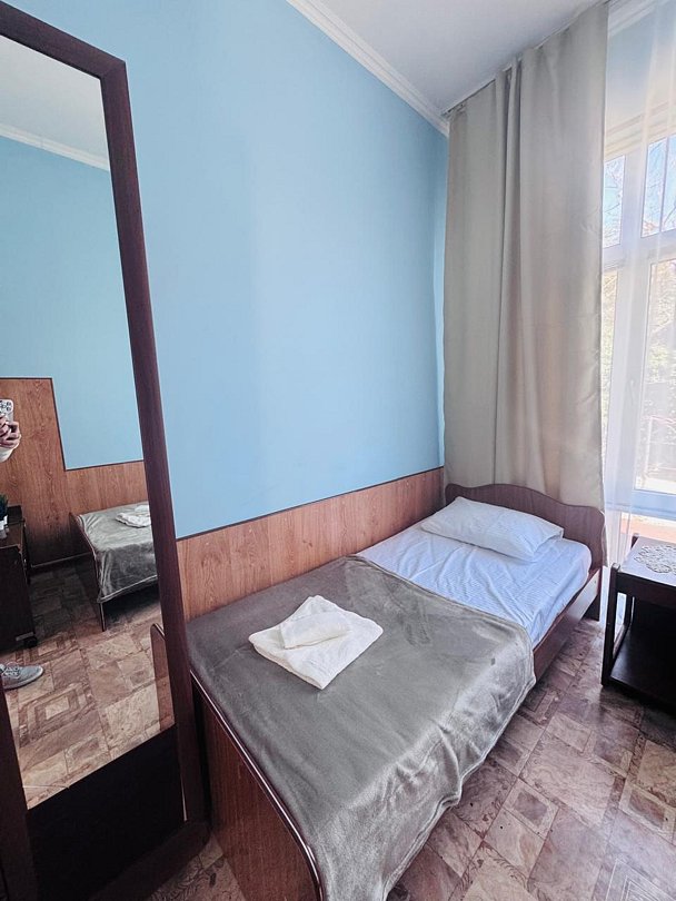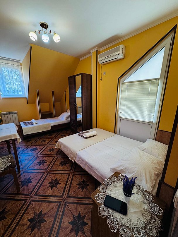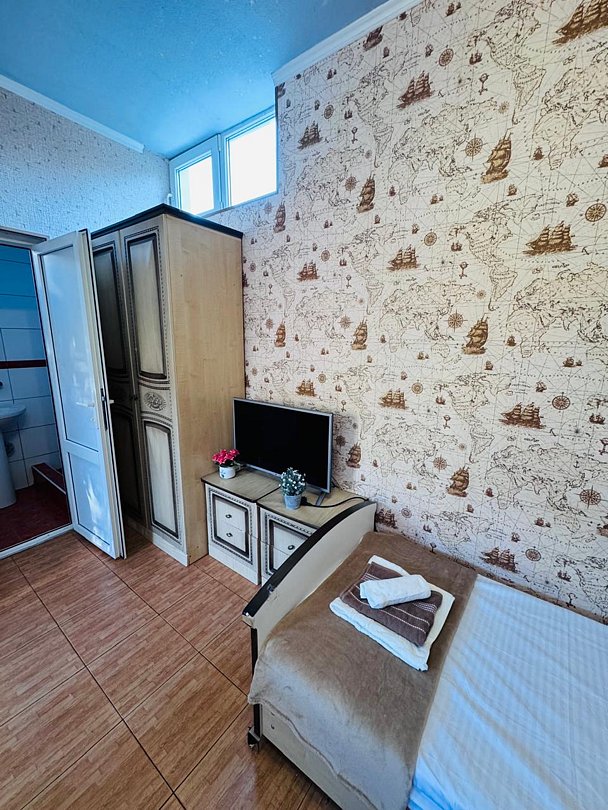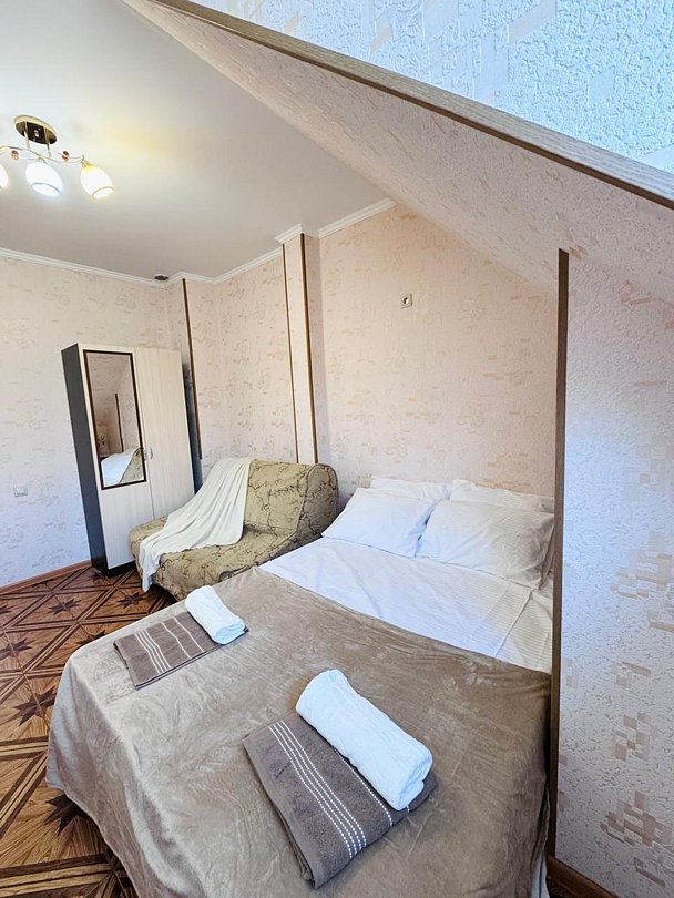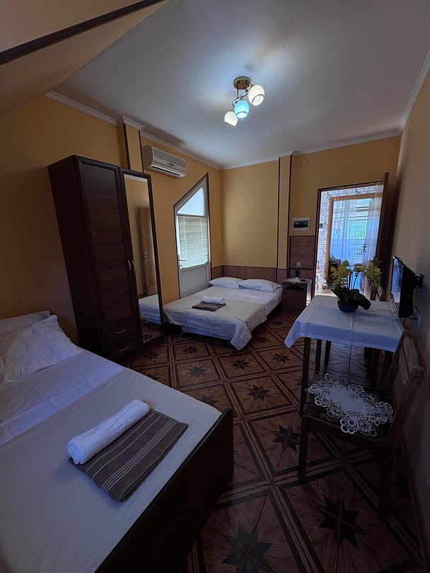 3-х местные номера категории «Эконом» - однокомнатные уютные номера, расположенные на 3 этаже гостевого дома, в каждом номере – 2-х спальная кровать+1-но спальная кровать, либо 3 раздельные односпальные кровати, либо 2-х спальная кровать и диван, шкаф для одежды, прикроватные тумбочки, телевизор, кондиционер, обеденный стол, стулья. Санузел (душ, туалет, умывальник) и холодильник на 4 номера в общем коридоре. Возможно дополнительное место – еврораскладушка.В номере