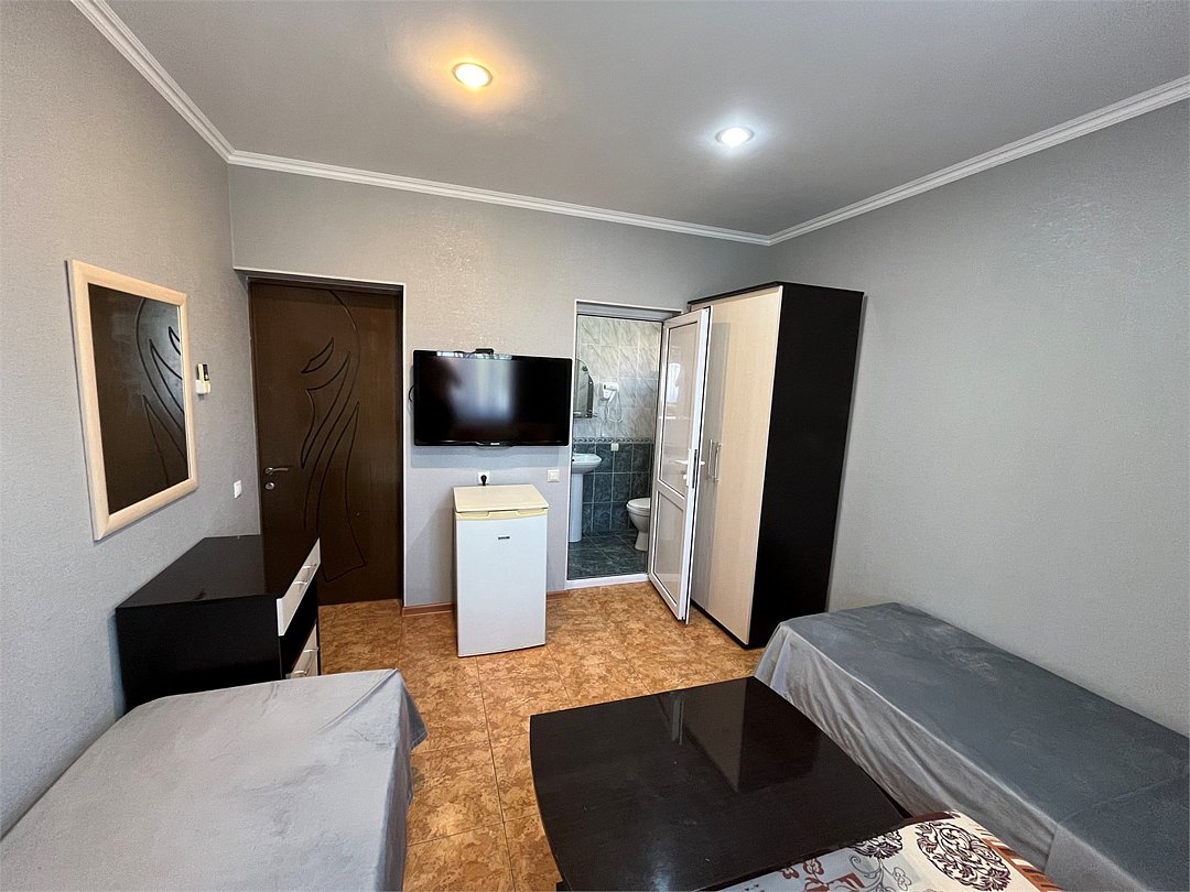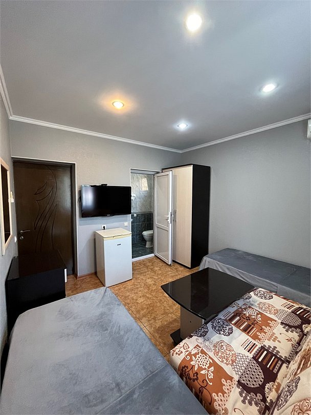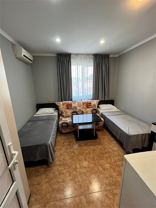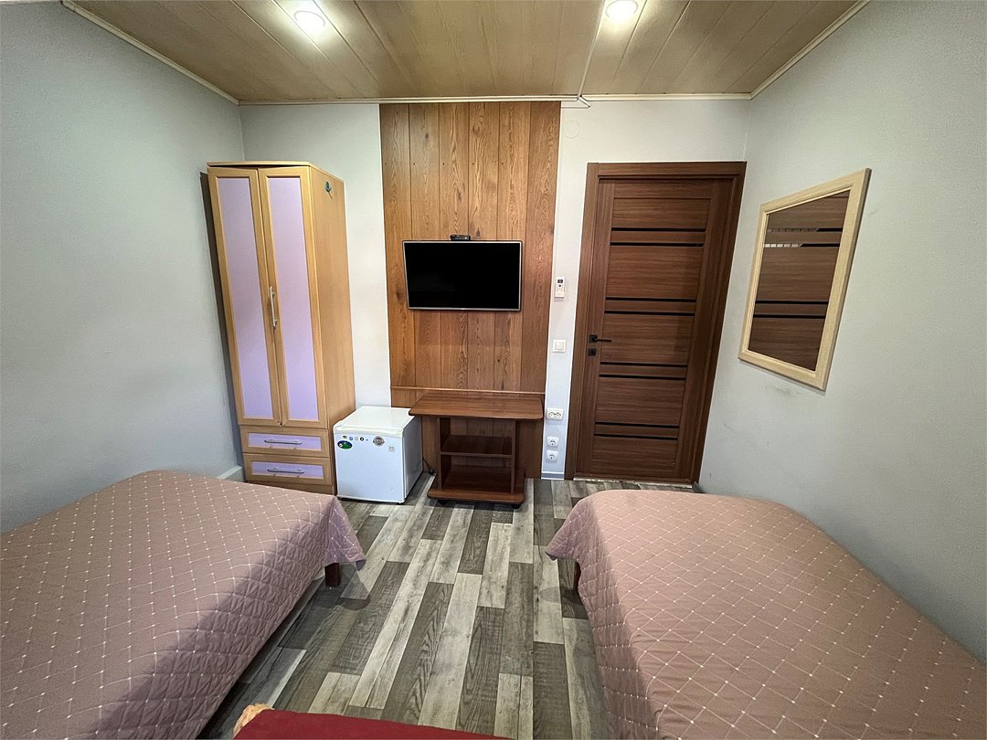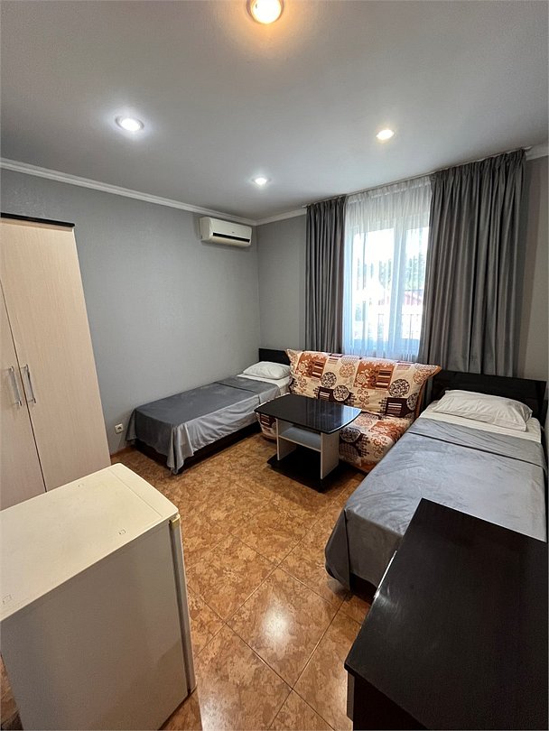 В номере две односпальные кровати и диван-кровать 1.40, душ туалет в комнате, в номере телевизор, холодильник, кондиционер, Общая кухня, мангал, стиральная машинка. Бесплатный WiFiУслуги и удобства