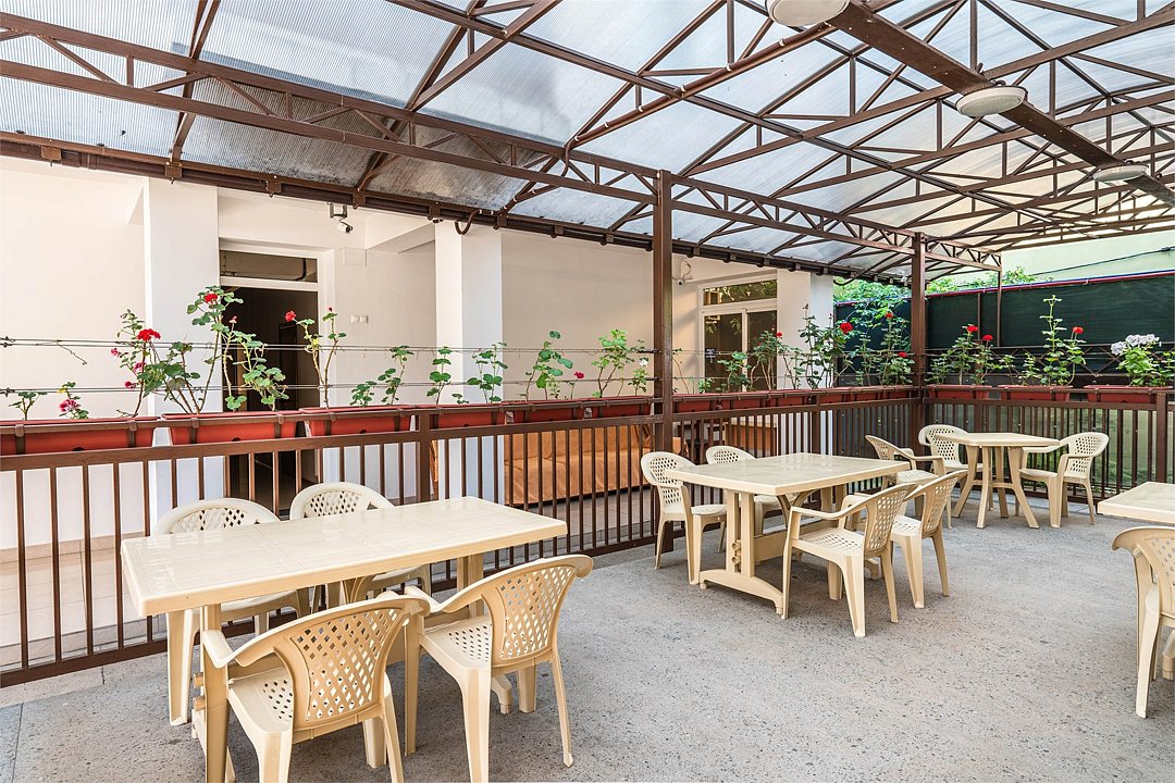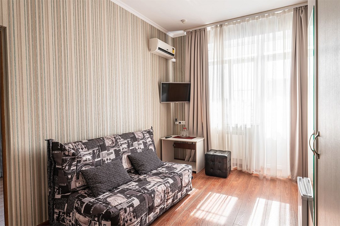Однокомнатный номер (студия) с двумя односпальными или одной двуспальной кроватью. В номере есть кондиционер, телевизор, мини — холодильник. В санузле имеется душ. Площадь номера — 28кв.м. В гостевом доме есть общая кухня, оборудованная всем необходимым, газовые плиты, микроволновка, чайники, посуда,холодильники и прочая кухонная утварь. Уютный двор.Услуги и удобства