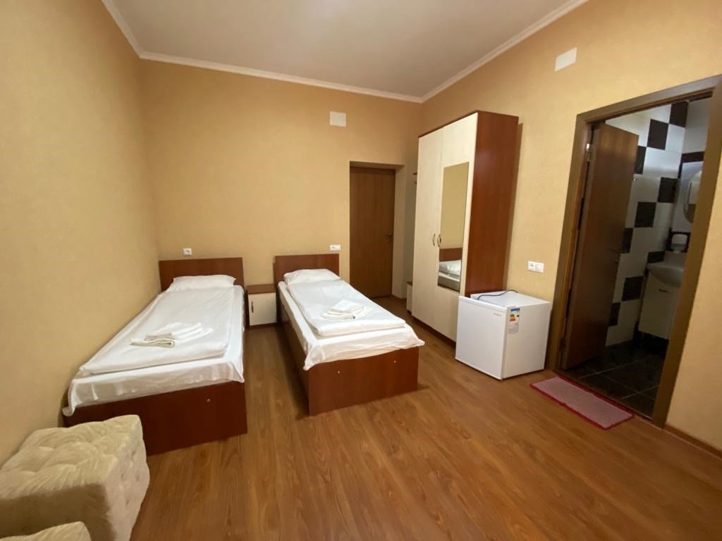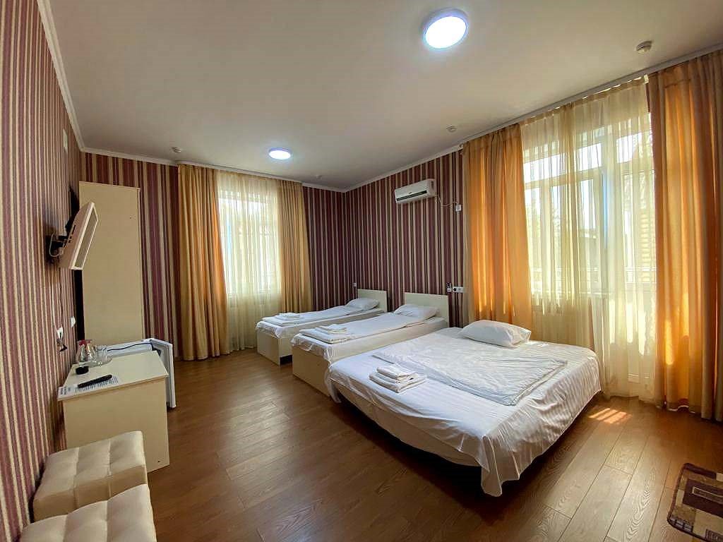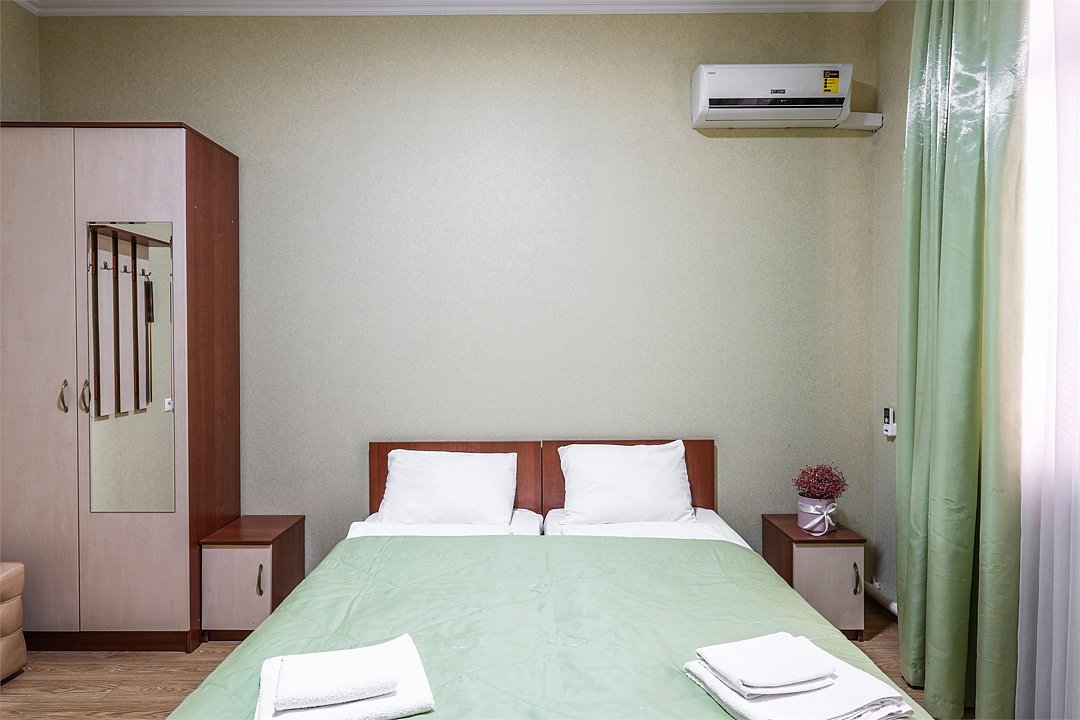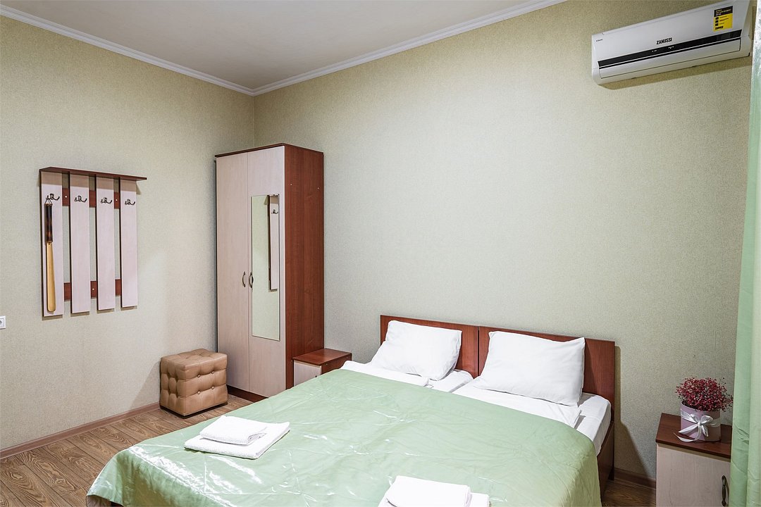 Однокомнатный номер с двумя односпальными или одной двуспальной кроватью. В номере есть кондиционер, телевизор, мини — холодильник. В санузле имеется душ. Площадь номера — 16 кв.м. В гостевом доме есть общая кухня, оборудованная всем необходимым, газовые плиты, микроволновка, чайники, посуда,холодильники и прочая кухонная утварь. Уютный двор.Услуги и удобства