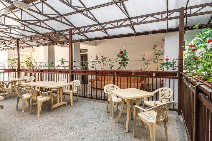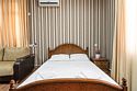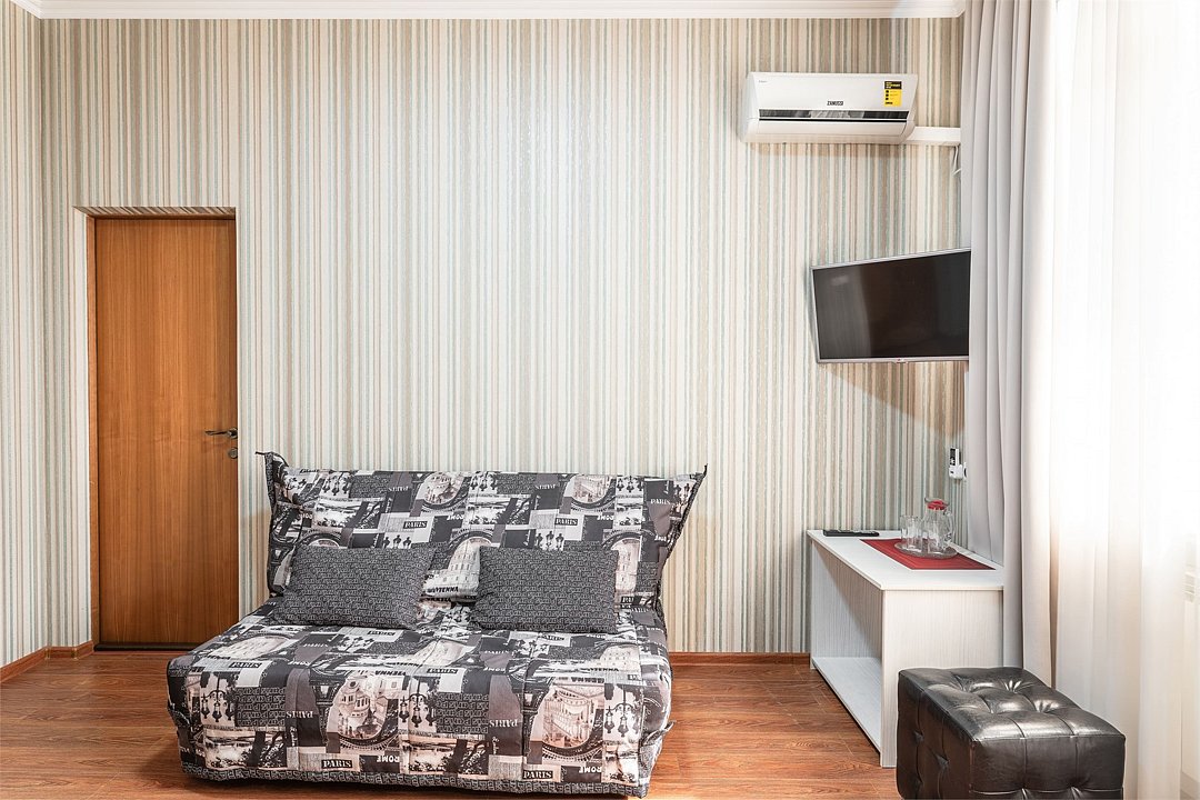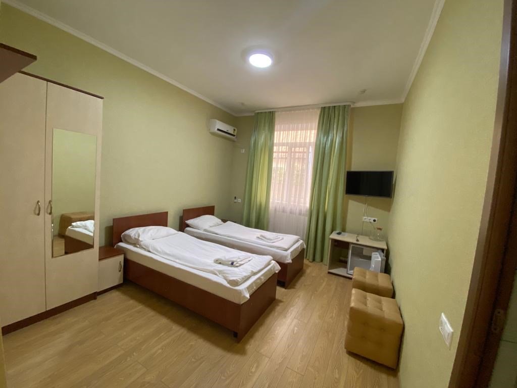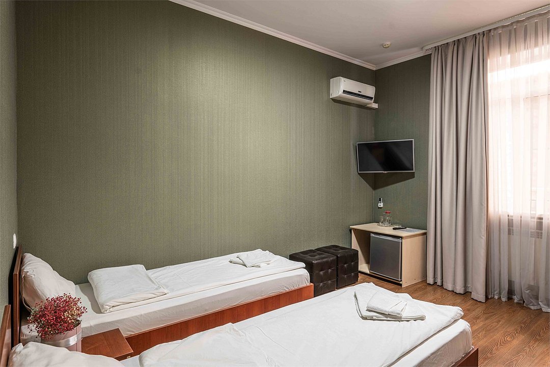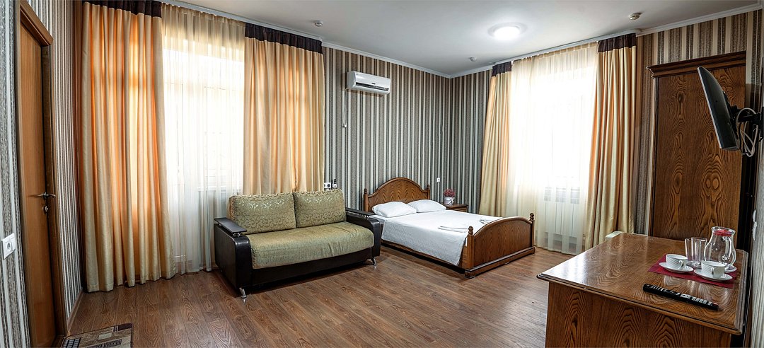 Однокомнатный номер с двумя односпальными или одной двуспальной кроватью. В номере есть кондиционер, телевизор, мини — холодильник. В санузле имеется душ. Площадь номера — 16 кв.м. В гостевом доме есть общая кухня, оборудованная всем необходимым, газовые плиты, микроволновка, чайники, посуда,холодильники и прочая кухонная утварь. Уютный двор.Услуги и удобства