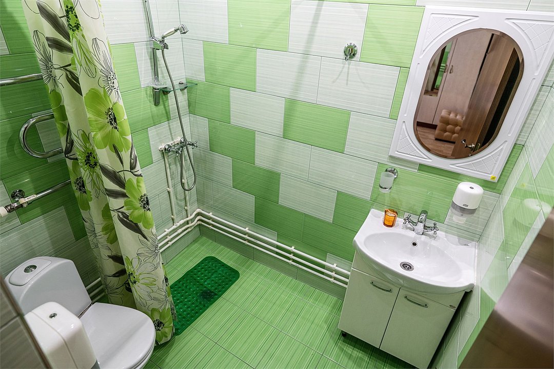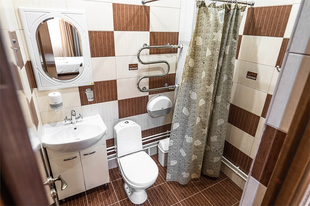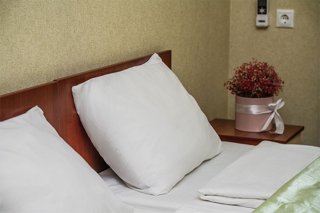 Wi-Fi, светильник, фен, утюг, ванная комната, санузел, банные полотенца, балкон, две односпальные или большая двуспальная кровать, тумбы, шкаф для одежды, вешалки, зеркало, пуфики, унитаз, раковина, отопление, душ, вид на город, ламинат, стаканы, стол, туалет, сплит-система, сушилка для белья, телевизор с плоским экраном, мини-холодильник, москитная сетка, уборка номера, услуги прачечной (платно), вешалки-плечики, мылоВ номере