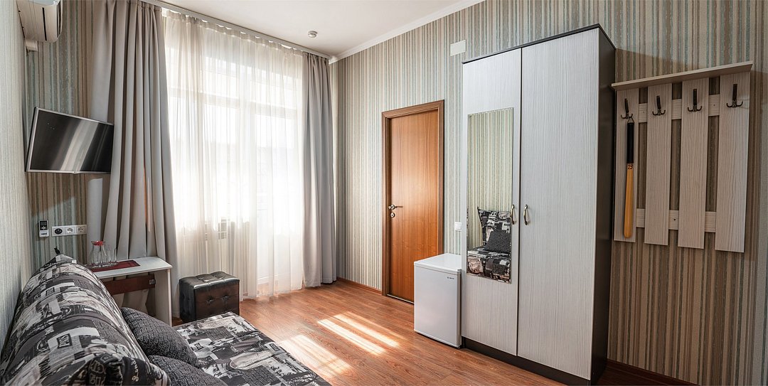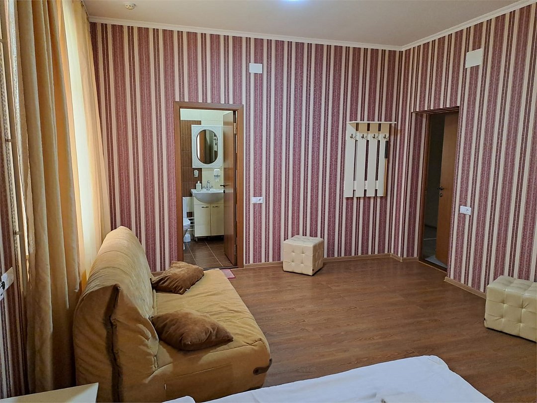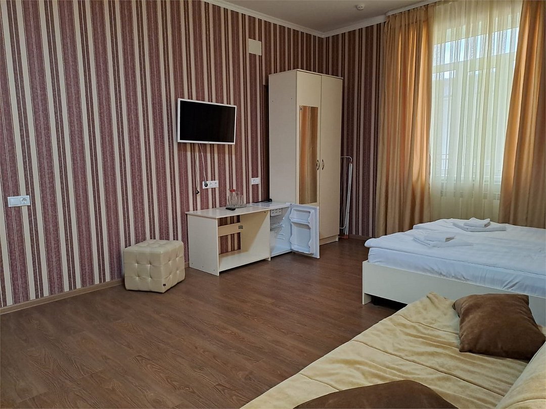 Уютный номер 19 кв.м. с удобным зонированием, предусмотрено всё для комфортного и полноценного отдыха: уютная кровать, холодильник, телевизор, мини холодильник. Номер с балконом. В номере предусмотрено дополнительное место на 1 гостя. В гостевом доме есть общая кухня, оборудованная всем необходимым, газовые плиты, микроволновка, чайники, посуда,холодильники и прочая кухонная утварь. Уютный двор.Услуги и удобства