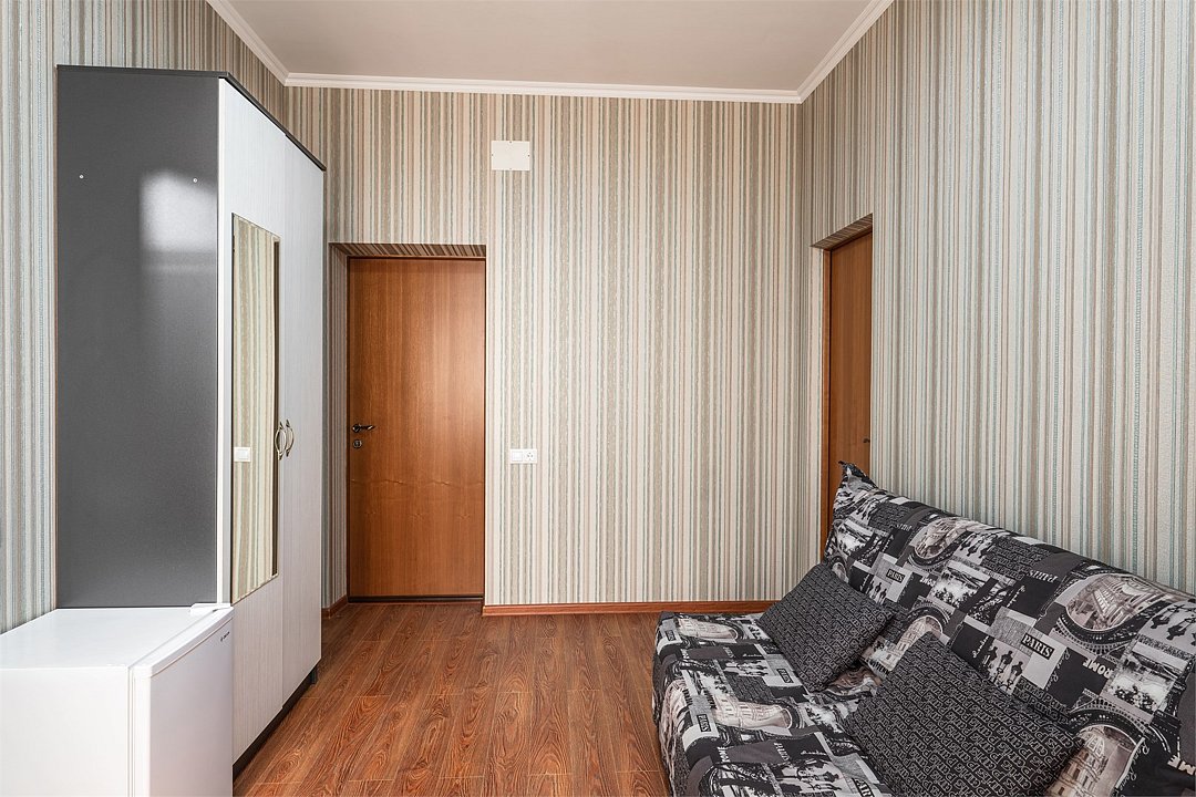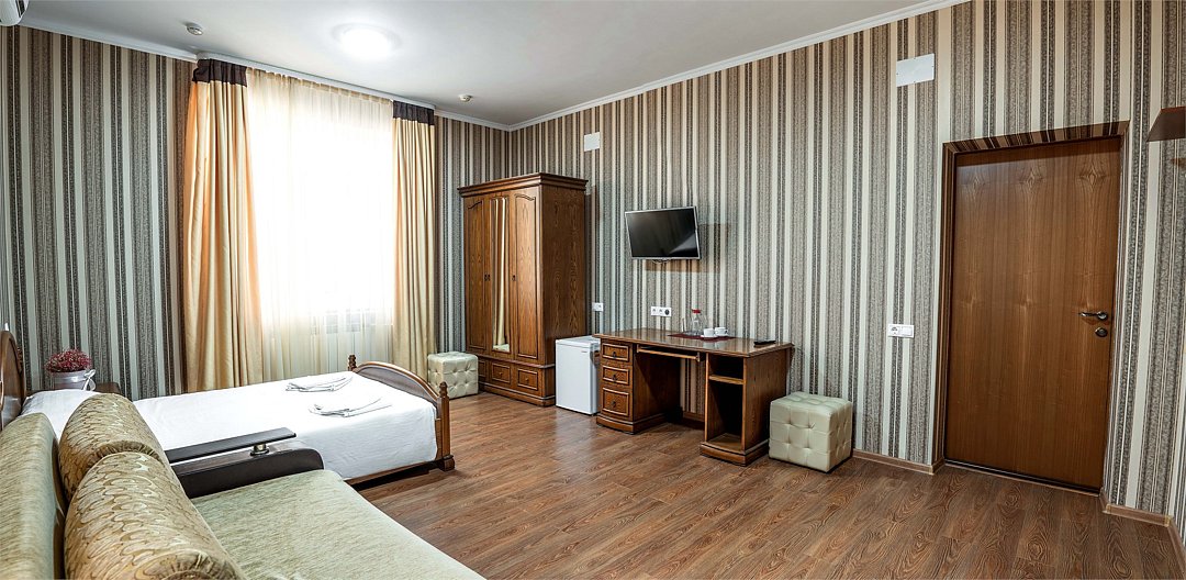 Светлый двухкомнатный номер 25 кв.м, который идеально подойдет для отдыха всей семьей. Номер укомплектован всем необходимым для полноценного отдыха: спальня с большой двуспальной кроватью, гостиная комната с диваном и пуфиками, холодильник, телевизор. Номер с балконом.Услуги и удобства