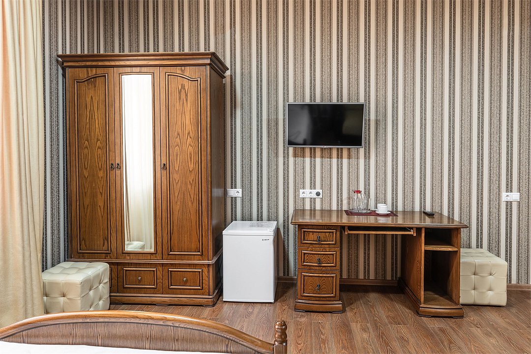 Wi-Fi, светильник, фен, утюг, санузел, банные полотенца, две односпальные или большая двуспальная кровать, гладильная доска, тумбы, шкаф для одежды, вешалки, зеркало, пуфики, унитаз, раковина, отопление, душ, вид на город, вид во двор, ламинат, стаканы, стол, туалет, сплит-система, телевизор с плоским экраном, мини-холодильник, москитная сетка, уборка номера, услуги прачечной (платно), вешалки-плечики, мылоВ номере