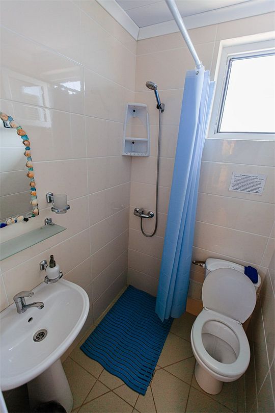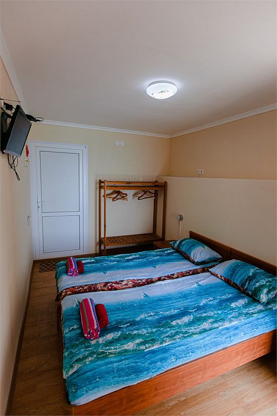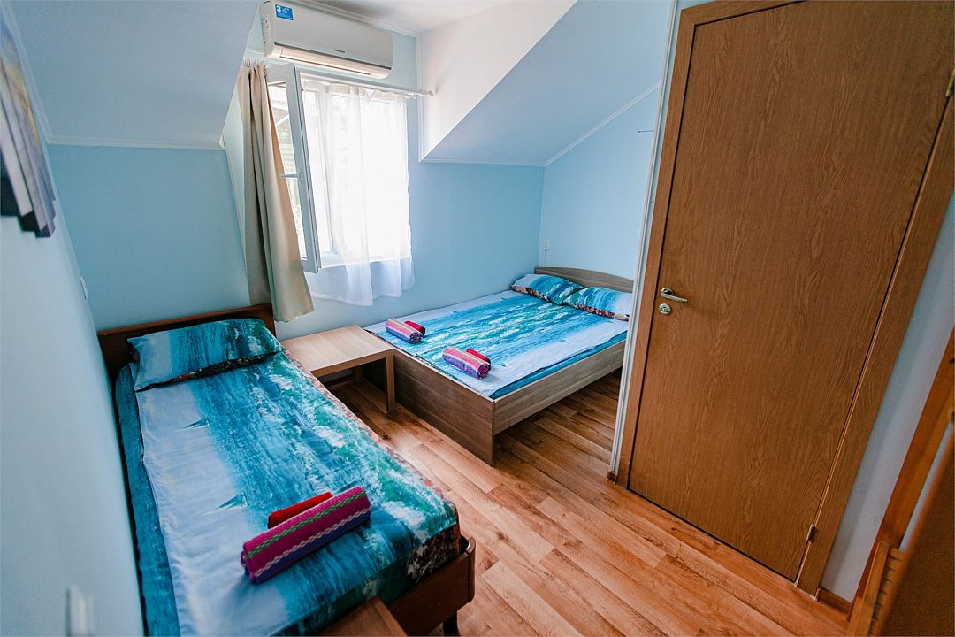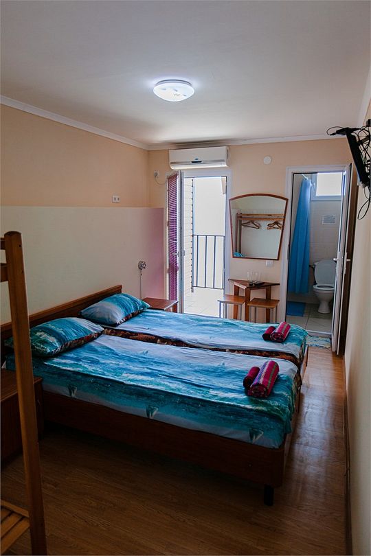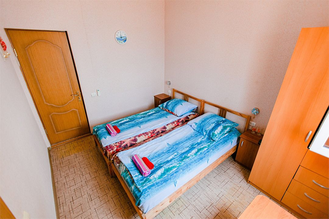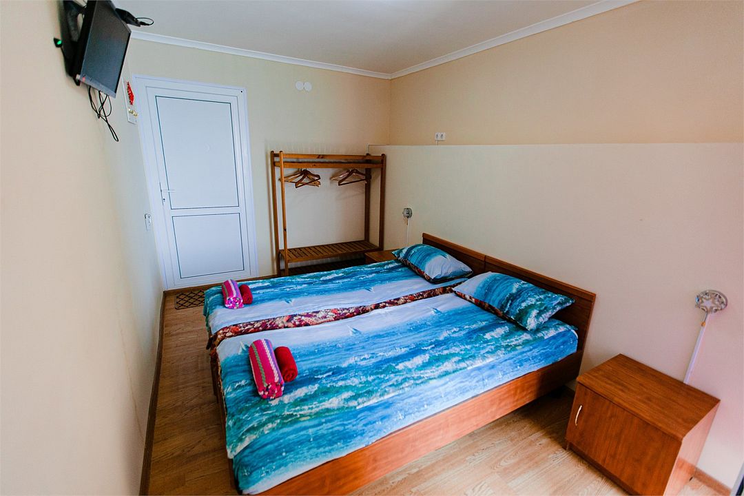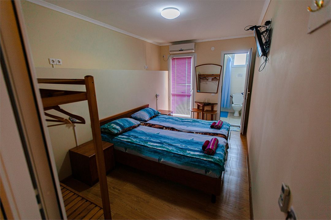 Четырехместный номер с двумя односпальными и одной двухъярусной кроватью. В номере кондиционер, балкон с видом на море, санузел с душем и туалетом, телевизор, вентилятор, стол, стулья, шкаф для одежды, тумбочки, чайник, фен. На всей территории отеля бесплатный wi-fi, парковка, место для барбекю. Общая кухня оборудована всей посудой и техникой: плита, холодильник, микроволновая печь, чайник, миксер, кофеварка, любая посуда.Услуги и удобства