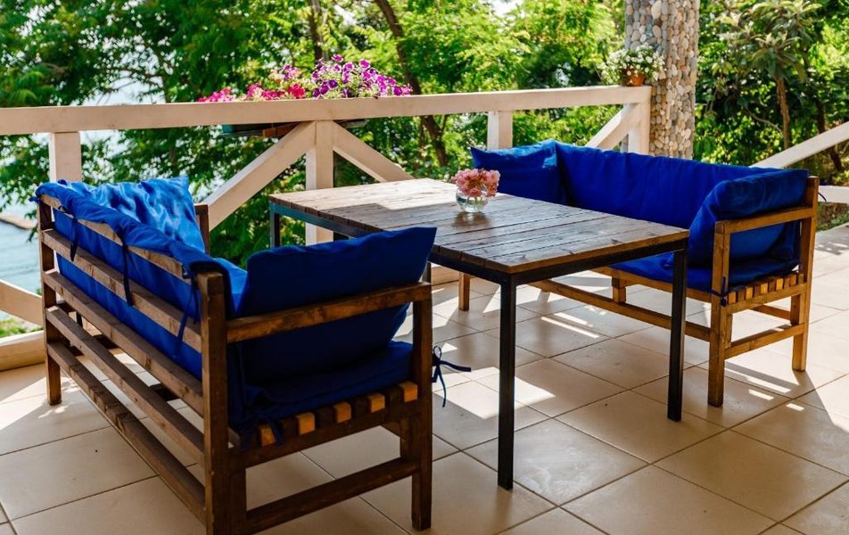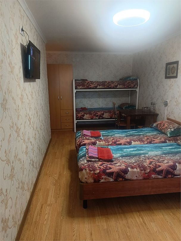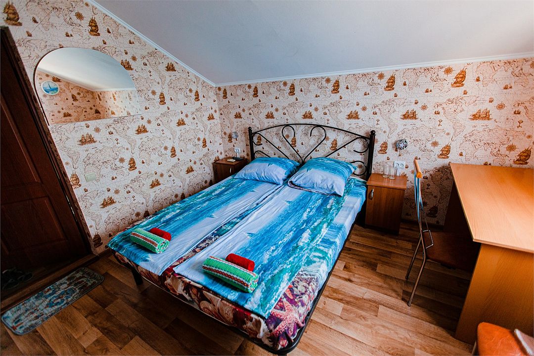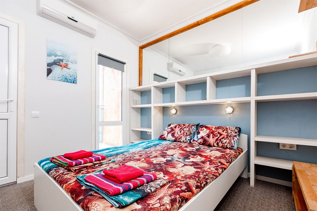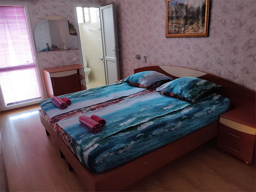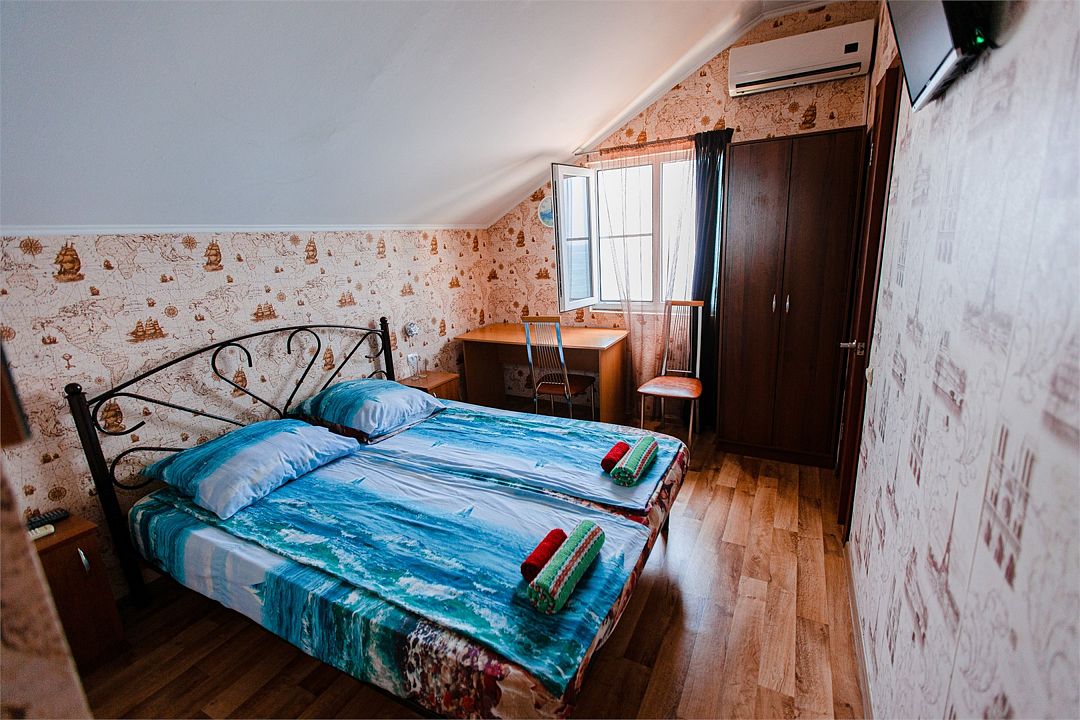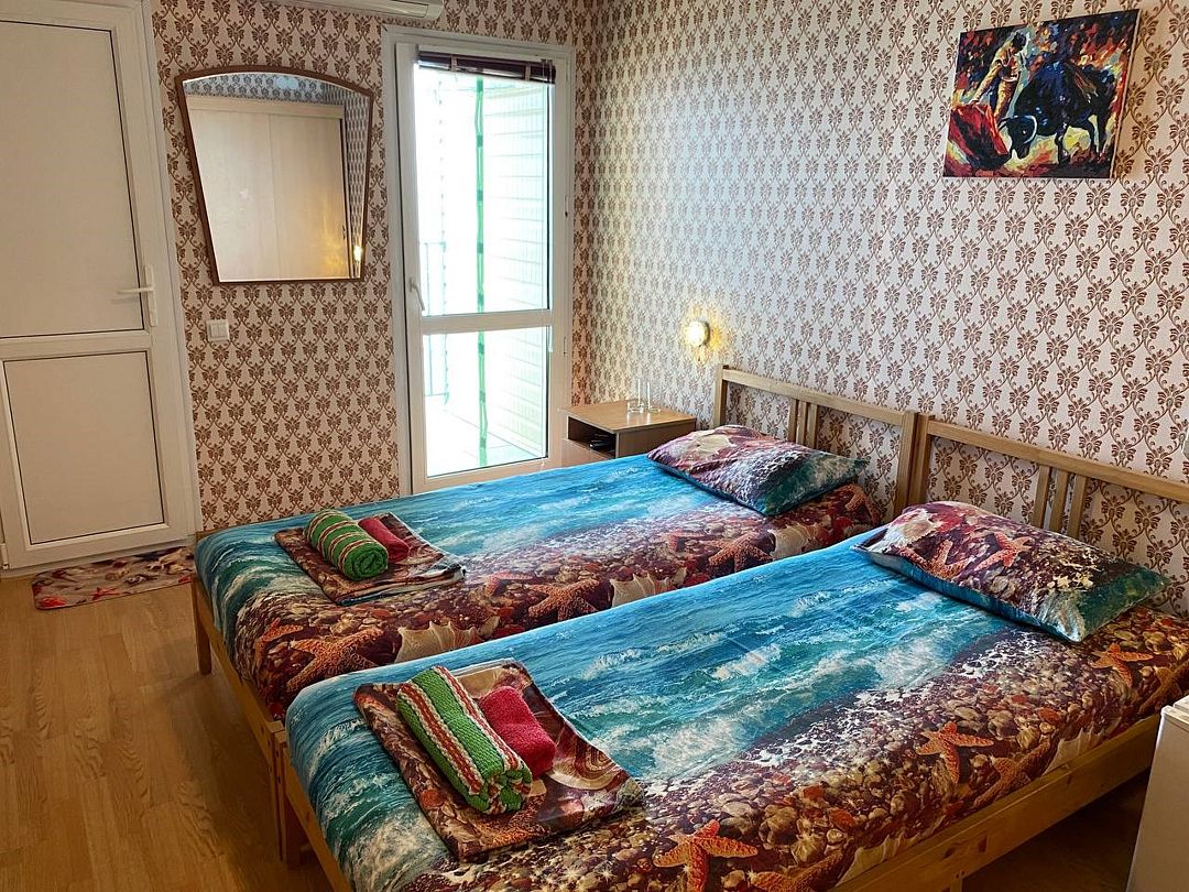 Четырехместный номер с двумя односпальными и одной двухъярусной кроватью. В номере кондиционер, балкон с видом на море, санузел с душем и туалетом, телевизор, вентилятор, стол, стулья, шкаф для одежды, тумбочки, чайник, фен. На всей территории отеля бесплатный wi-fi, парковка, место для барбекю. Общая кухня оборудована всей посудой и техникой: плита, холодильник, микроволновая печь, чайник, миксер, кофеварка, любая посуда.Услуги и удобства