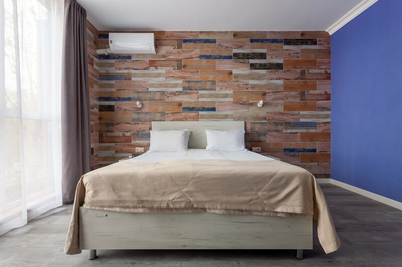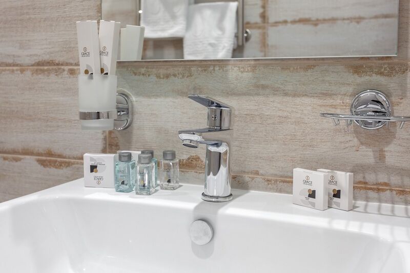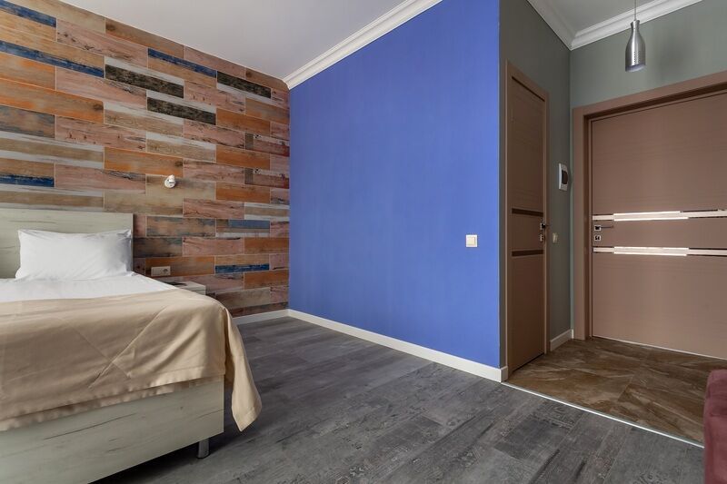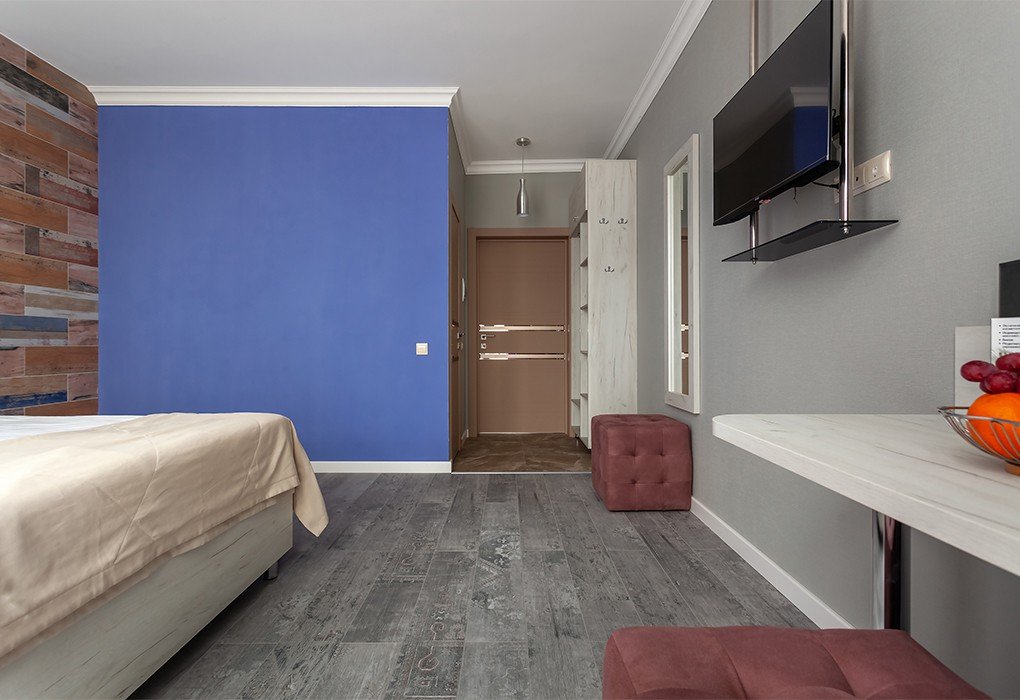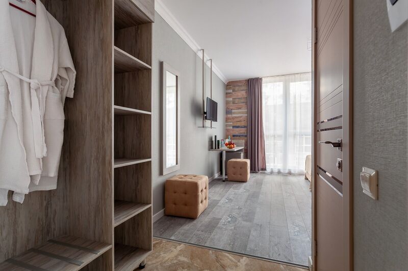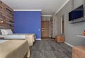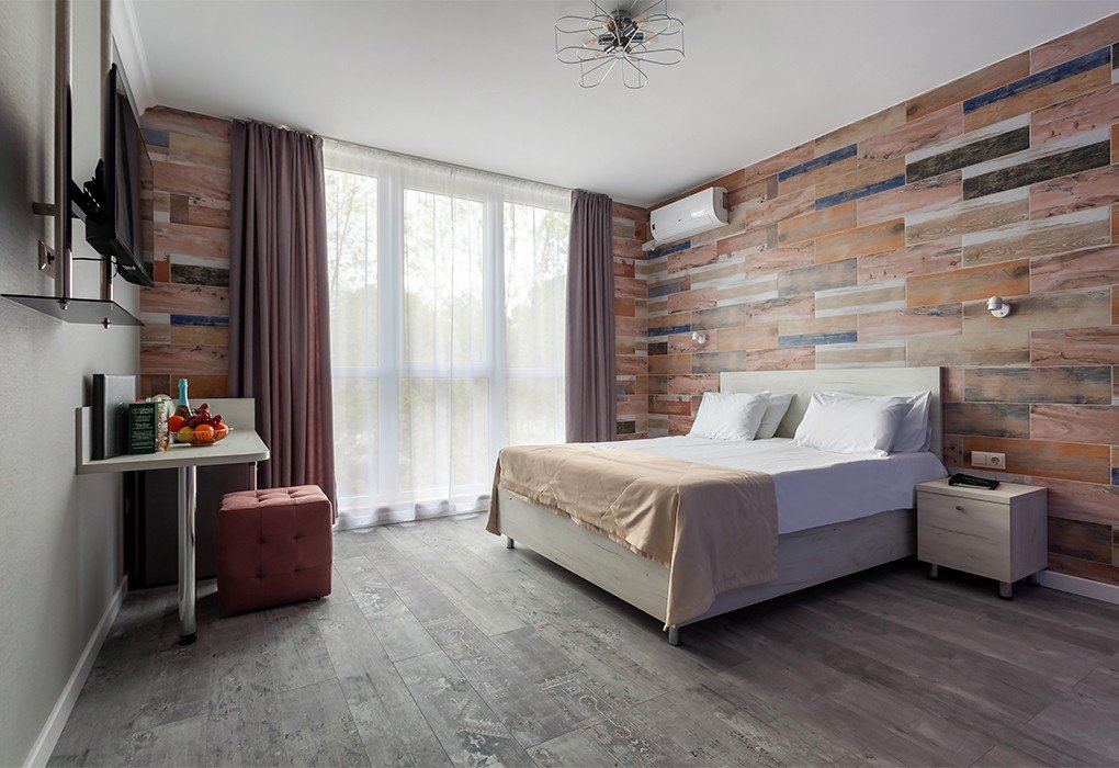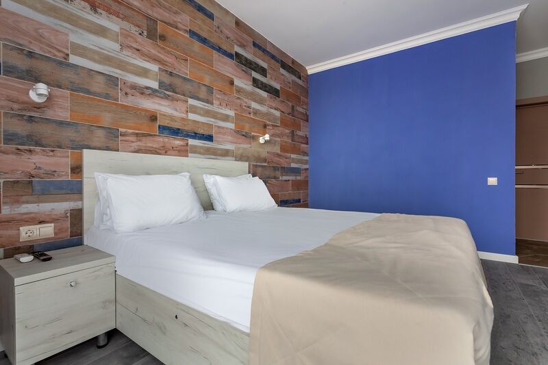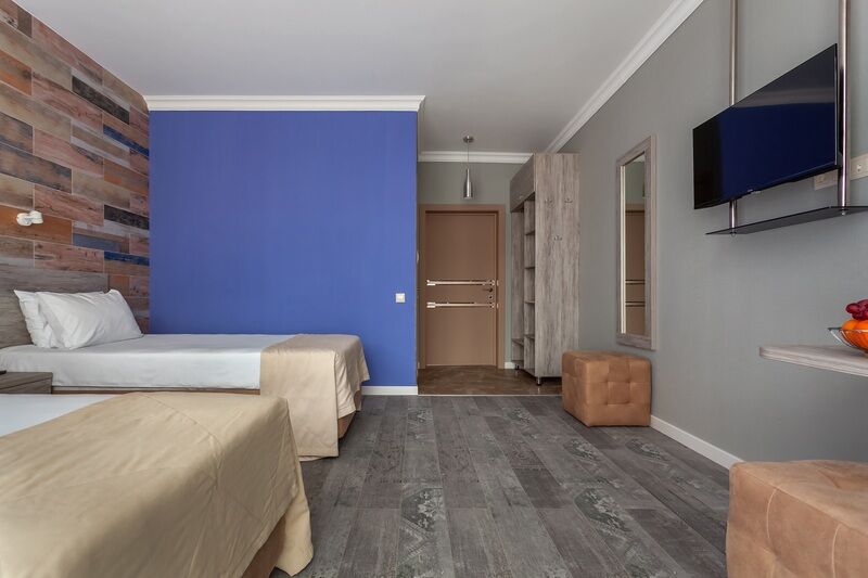 Корпус отеля занимает территорию площадью 3000 кв. м. и располагается в 200 метрах от моря. Гостей ожидают 40 двухместных номеров категории Стандарт. В комнатах современный интерьер, выдержанный в светлых оттенках с добавлением акцентного синего. Номера оснащены сплит-системой, есть отдельный санузел с душем, телевизор и холодильник.