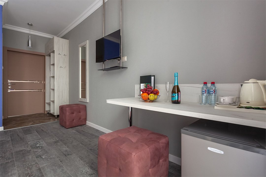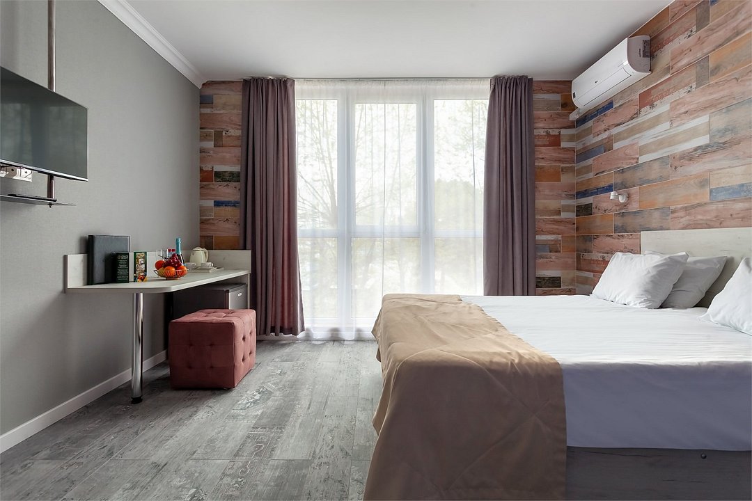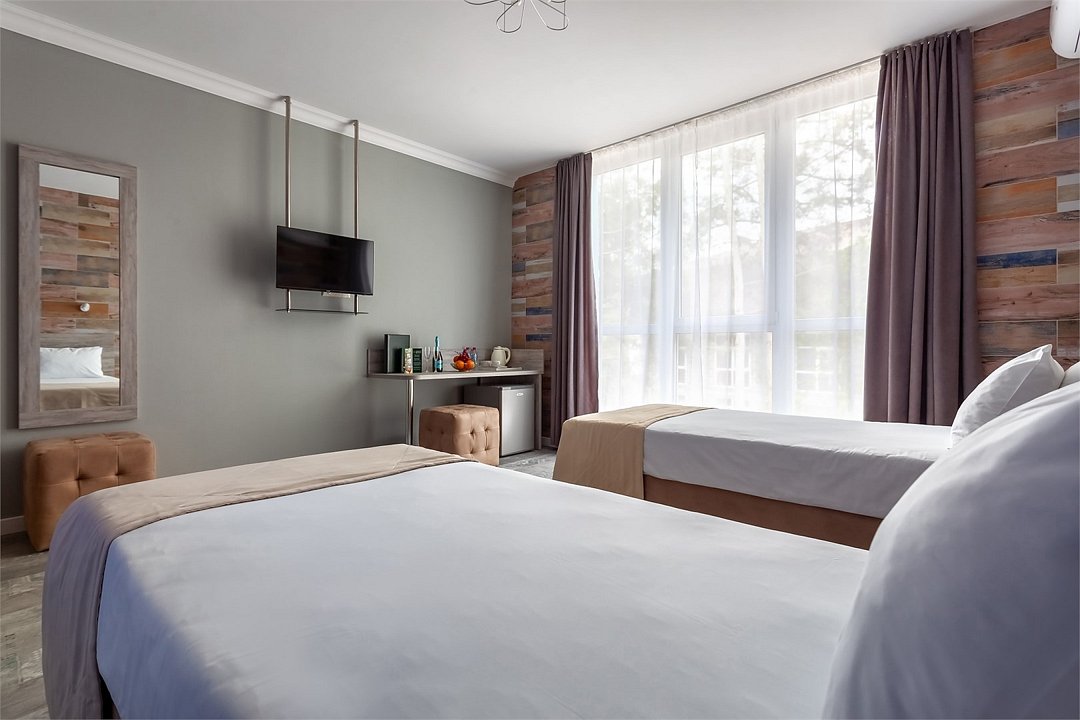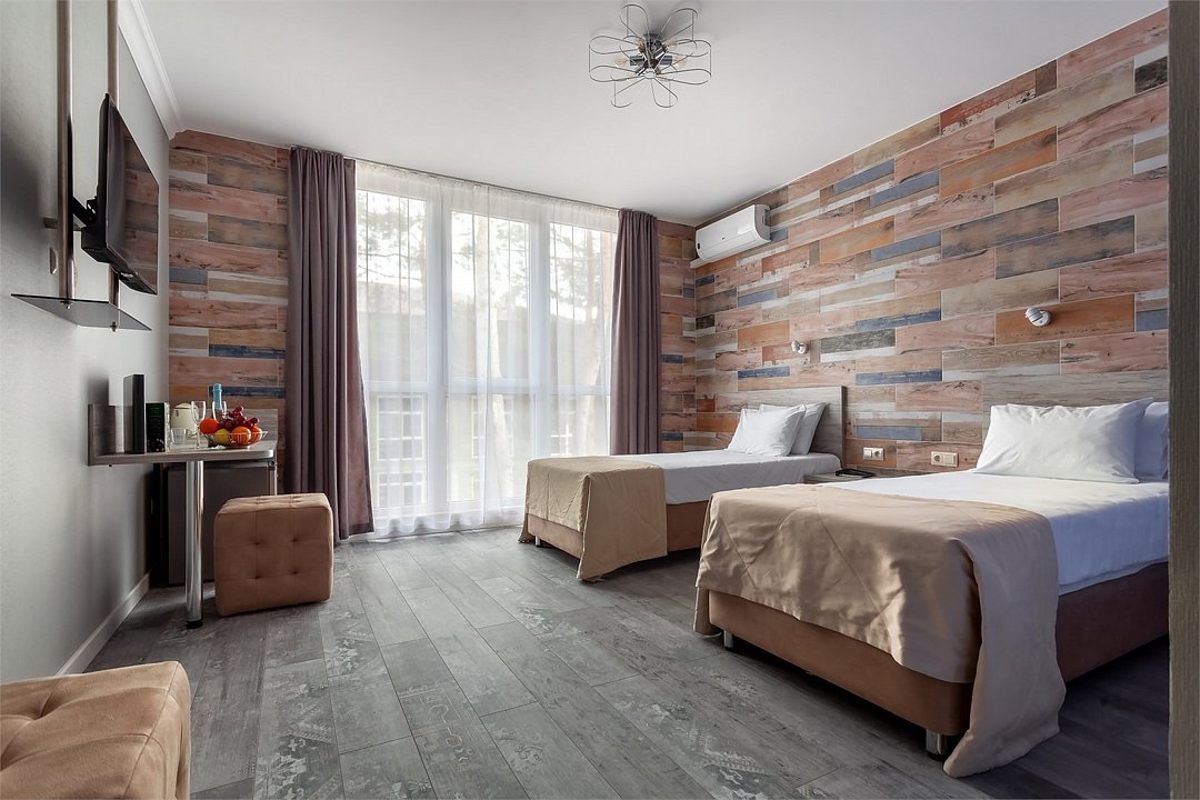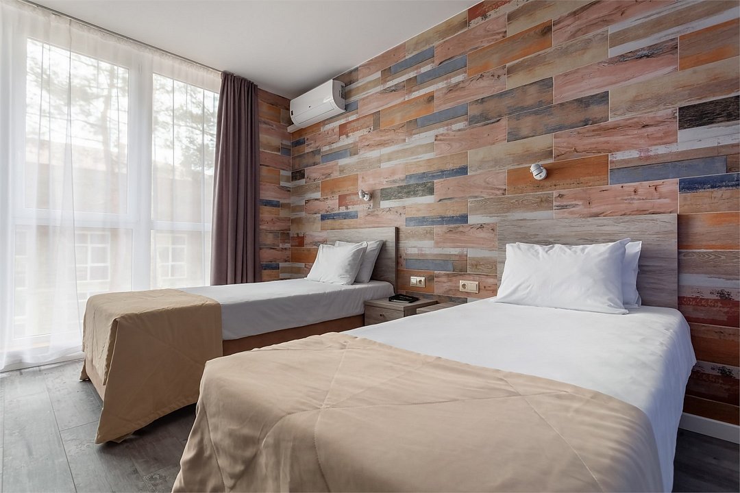 Стандартный номер с двумя раздельными кроватями. Без балкона, но с панорамными окнами. В Номере есть все для комфортного проживания: кровать, шкаф-купе, тумба, зеркало, телевизор, холодильник, WI-FI. * Проживание детей до 4 лет бесплатно Халаты в данной категории предоставляются за отдельную плату в размере 500 руб. на весь срок проживания.Услуги и удобства