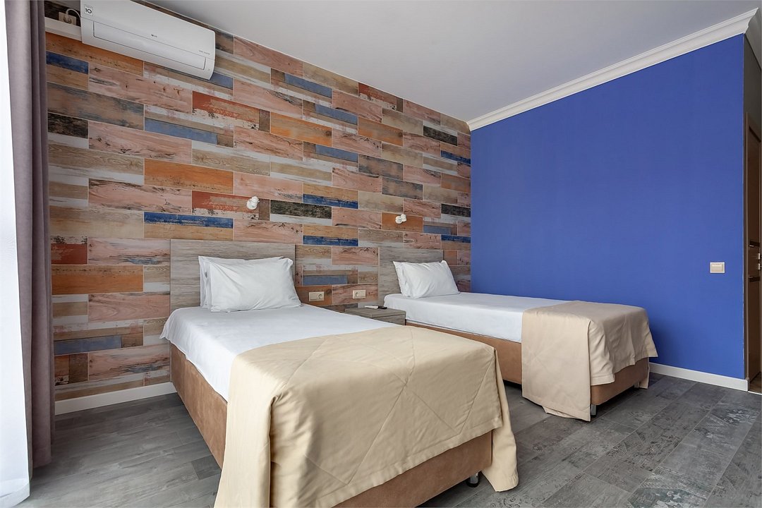 Wi-Fi, телефон, кондиционер, фен, утюг, ванная комната, душевая кабина, банные принадлежности, банные полотенца, тапочки, гигиенические средства, две односпальные кровати, вешалки, зеркало, пуфики, сейф, чайник, раковина, отопление, вид во двор, тумба, туалетные средства, туалет, сплит-система, телевизор с плоским экраном, мини-холодильник, шкаф-купе, чайная станция, уборка номераВ гостиничном номере