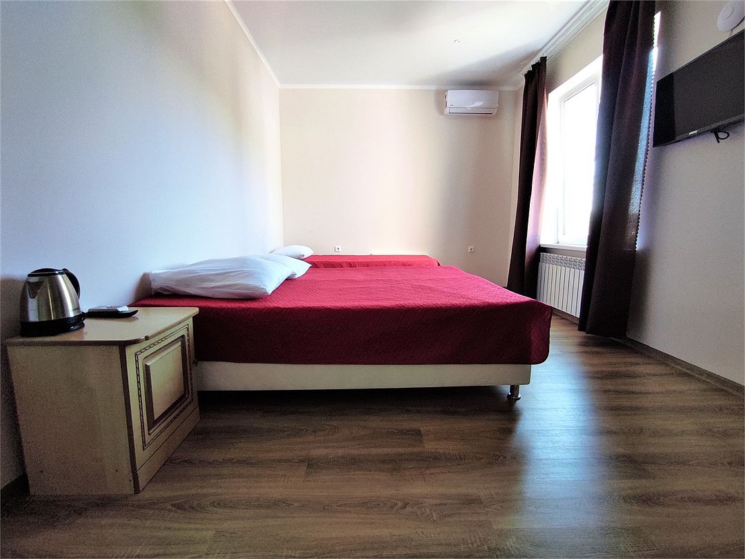 Этаж 1 или 2. Площадь номера: 22-24 кв.м. Количество основных мест: 3. Количество дополнительных мест: 1 (раскладная кровать) В номере: санузел (душ, туалет, умывальник, фен, тапочки, туалетные принадлежности), ТВ, холодильник, кондиционер, двуспальная и односпальная или три односпальные кровати, шкаф для одежды, тумбы, стол, стулья.Услуги и удобства