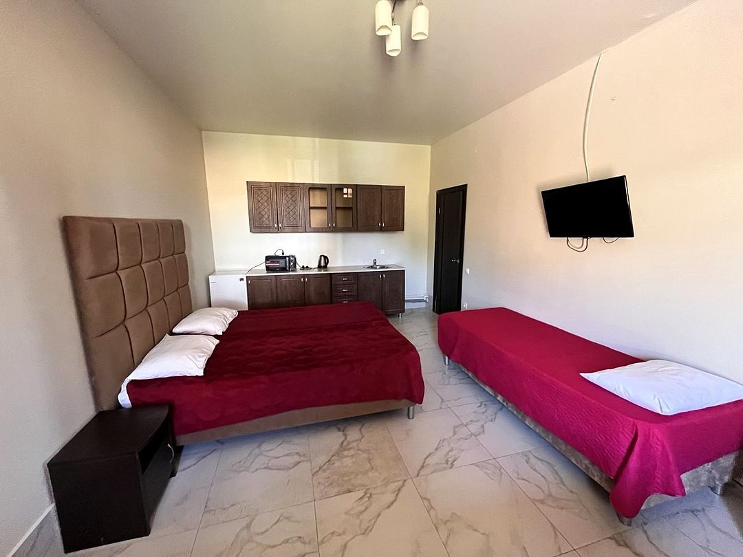 Этаж 1 или 2. Площадь номера: 22-24 кв.м. Количество основных мест: 3. Количество дополнительных мест: 1 (раскладная кровать) В номере: санузел (душ, туалет, умывальник, фен, тапочки, туалетные принадлежности), ТВ, мини-кухня (холодильник, микроволновка, мойка, чайник, посуда), кондиционер, двуспальная и односпальная или три односпальные кровати, шкаф для одежды, тумбы, стол, стулья.Услуги и удобства